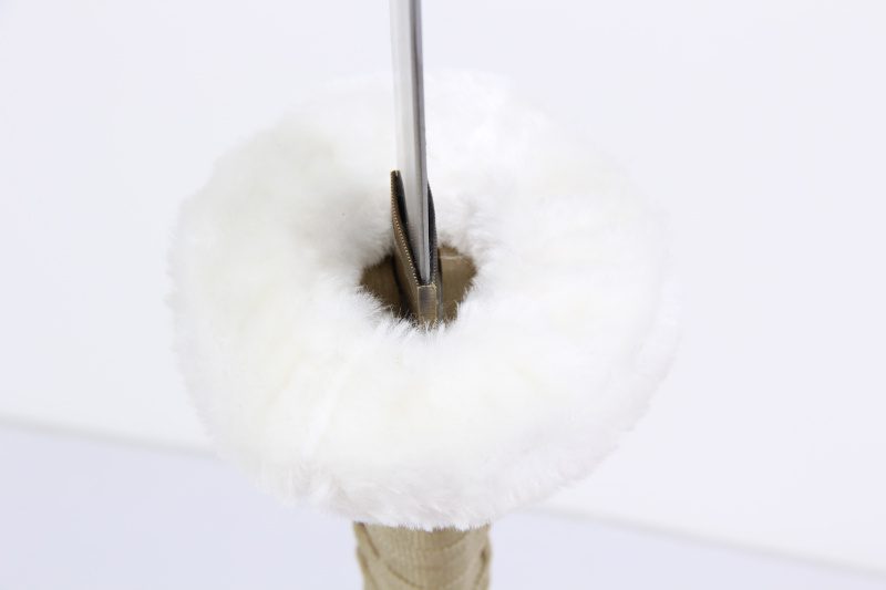 - Tsuba (鍔): rond, goudkleurige legering bedekt met wit fleece.