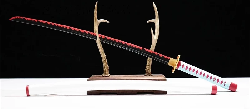 Het zwaard van Mitsuri is een nauwkeurige replica van het wapen dat in de manga wordt afgebeeld, met de hand gesmeed door onze meester-ambachtslieden. Het roze of rode lemmet staat symbool voor de vastberadenheid en passie van Mitsuri. De pareerstang, in de vorm van een klaver of vier harten, verwijst naar de liefde en compassie die zij koestert voor haar vrienden in haar strijd tegen demonen.