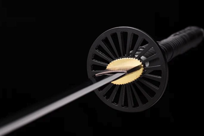 - Tsuba (鍔): gevormd als een zwart legering cartwheel, zowel duurzaam als esthetisch.