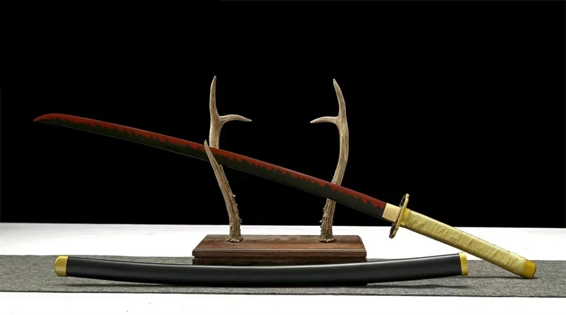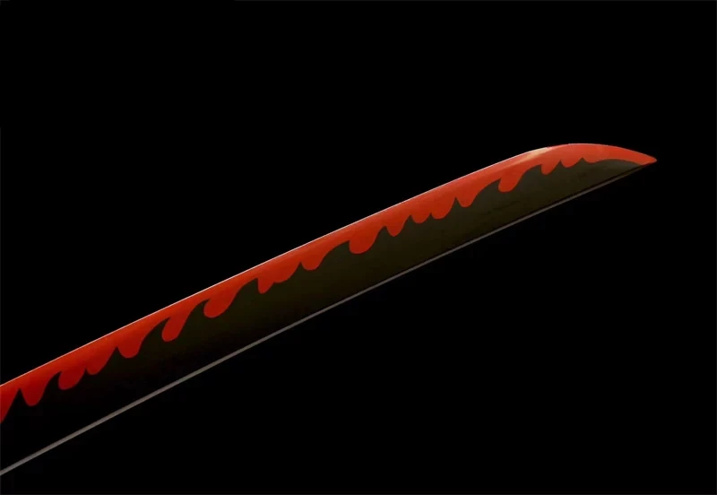 Het katana-zwaard van Yoriichi Tsugikuni heeft een zwart 1045 stalen lemmet met een felrode hamon, die doet denken aan de techniek van het ademen van de zon. De zwart-gouden pareerstang (Tsuba) is zeer elegant. Het handvat is bekleed met goudkleurig PU-leer. De afwerking van het lemmet, de vorm van de beschermkap en de gravures doen denken aan de esthetiek van de anime en bieden een authentieke replica van het zwaard van Yoriichi Tsugikuni.