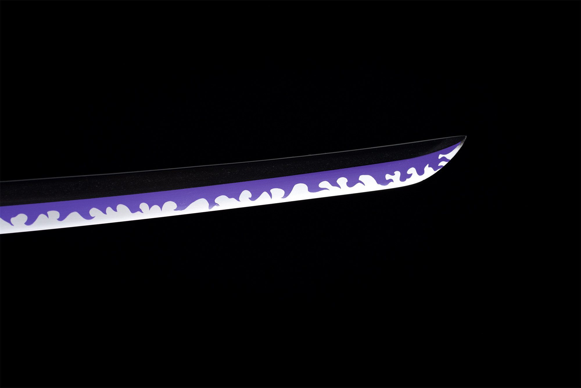 Het T10-stalen lemmet heeft een spectaculaire afwerking met zwarte, grijze en paarse tinten die de mysteries van Enma’s onderwereld oproepen. Deze unieke kleurstelling vangt op subtiele wijze het licht, terwijl de bloemvormige beschermkap met drie bloemblaadjes de dodelijke schoonheid van dit formidabele zwaard symboliseert. Het massief houten handvat biedt een stevige grip en is omwikkeld met zwart en rood vlechtwerk dat harmonieus contrasteert met de gouden bloemvormige menuki. De hardhouten schede is versierd met diepzwarte lak, versterkt door rode koorden die doen denken aan de banden van het lot, terwijl de gouden kojiri- en koiguchi-ringen een vleugje verfijnde elegantie toevoegen.