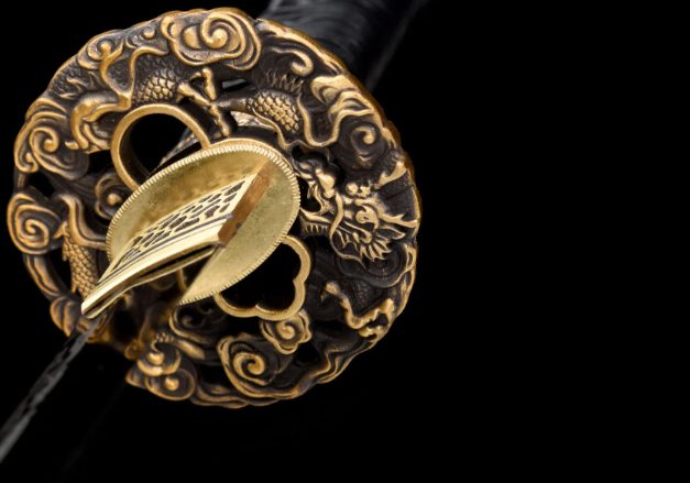 - Tsuba (鍔): rond, verguld ijzer, met draakmotief.