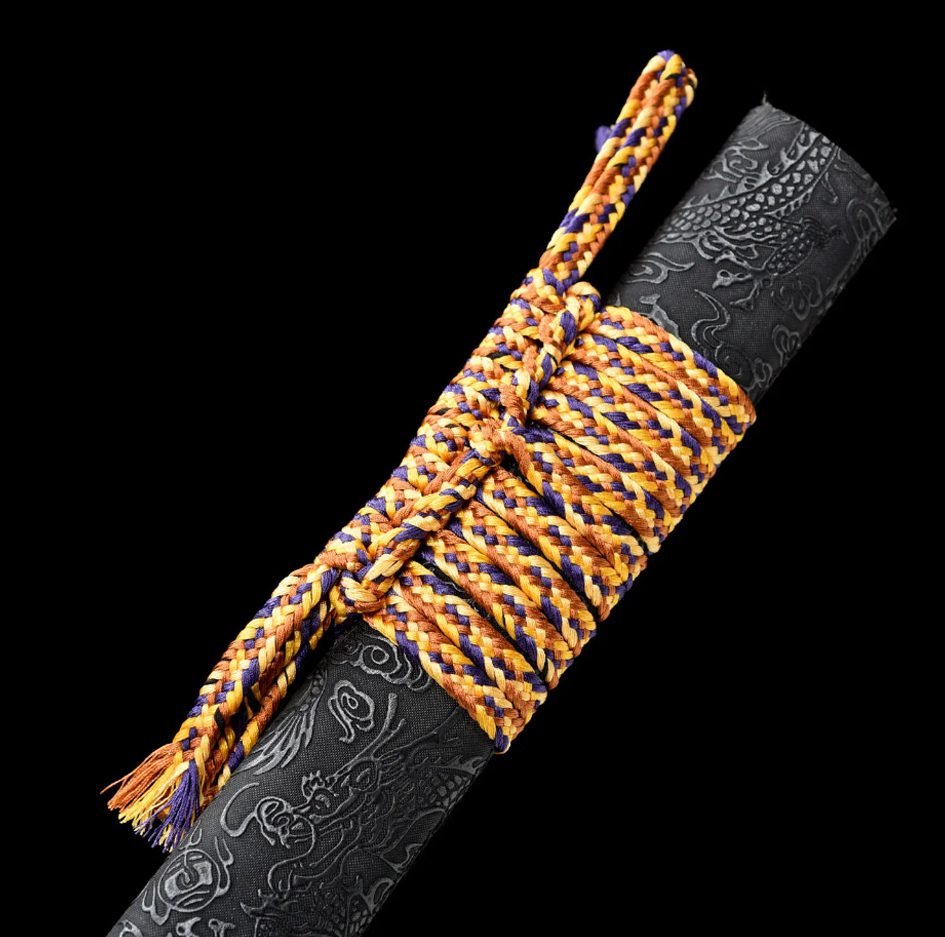 De ronde, vergulde ijzeren beschermkap is versierd met een draak en wordt bekroond door een vergulde messing habaki, eveneens met gravures. De dikke sageo, met een mix van oranje, paarse en gele tinten, voegt kleur toe aan deze zwarte ninjato. Met een totale lengte van 101 cm en een gewicht van 1,3 kg is deze ninjato uiterst handzaam en functioneel. De inbegrepen schede kan worden gebruikt om uw ninjato als decoratie tentoon te stellen.