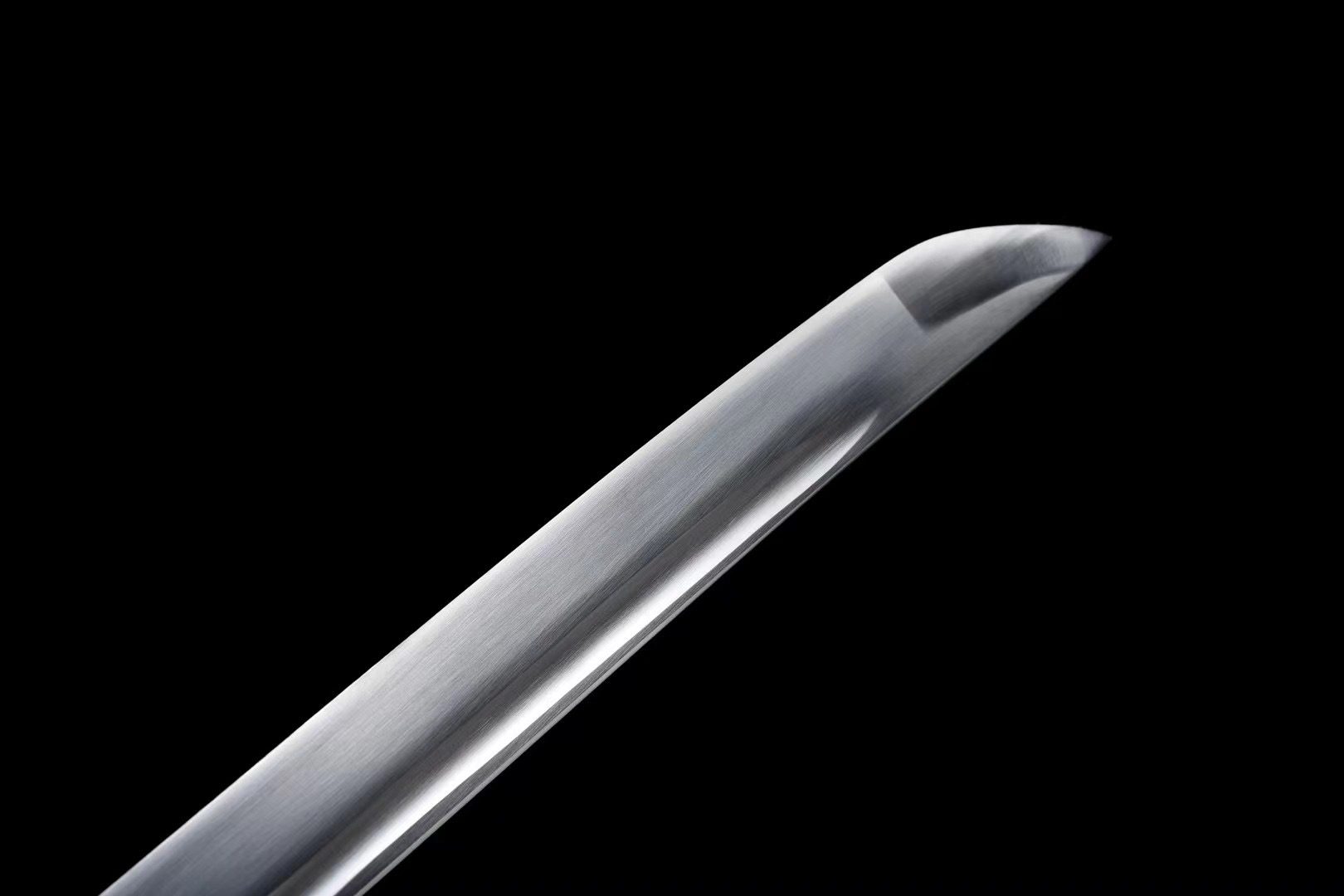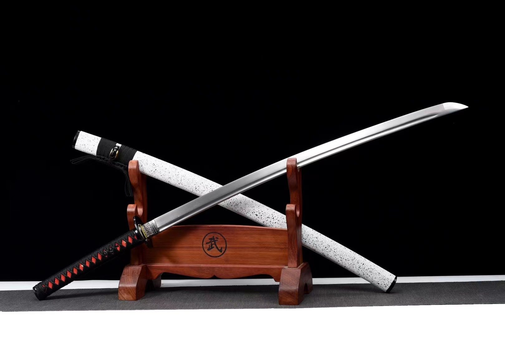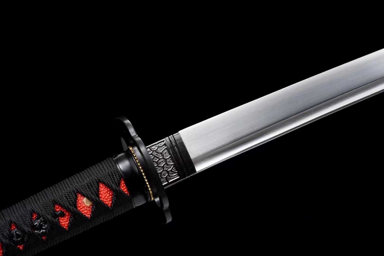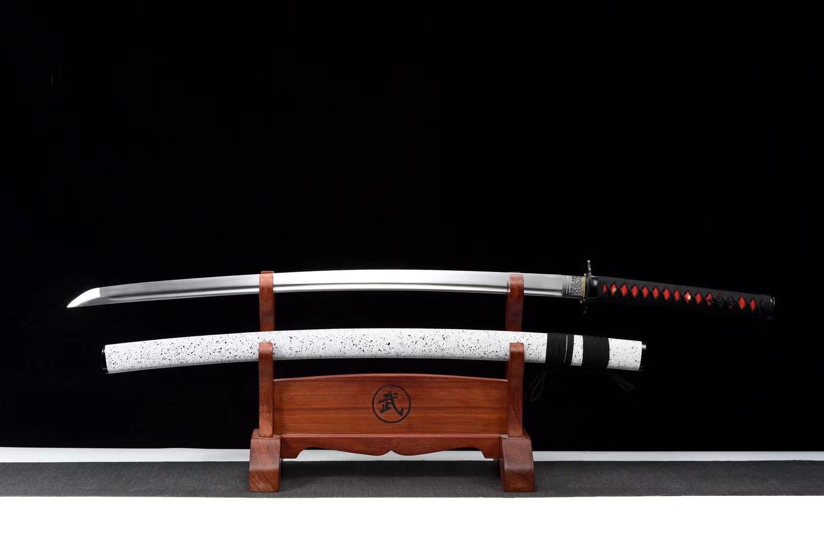 Het naturelkleurige T10-stalen lemmet heeft een gepolijste afwerking die het licht subtiel vangt, terwijl de bo-hi die in het oppervlak is gegraveerd het totale effect verlicht en een karakteristiek fluitend geluid produceert wanneer het wordt bewogen. De zwarte legering beschermkap (tsuba) heeft een holle kruisvorm met bloemmotief. Het handvat (tsuka) combineert de ruwe textuur van rode imitatie roggenhuid met zwart vlechtwerk met ruitpatroon (tsuka-ito), waardoor een stevige grip ontstaat. De menuki stellen een zwarte draak voor. De witgelakte houten schede (saya) met zwarte stippen doet denken aan een sterrenhemel en wordt aangevuld met een zwarte sageo.