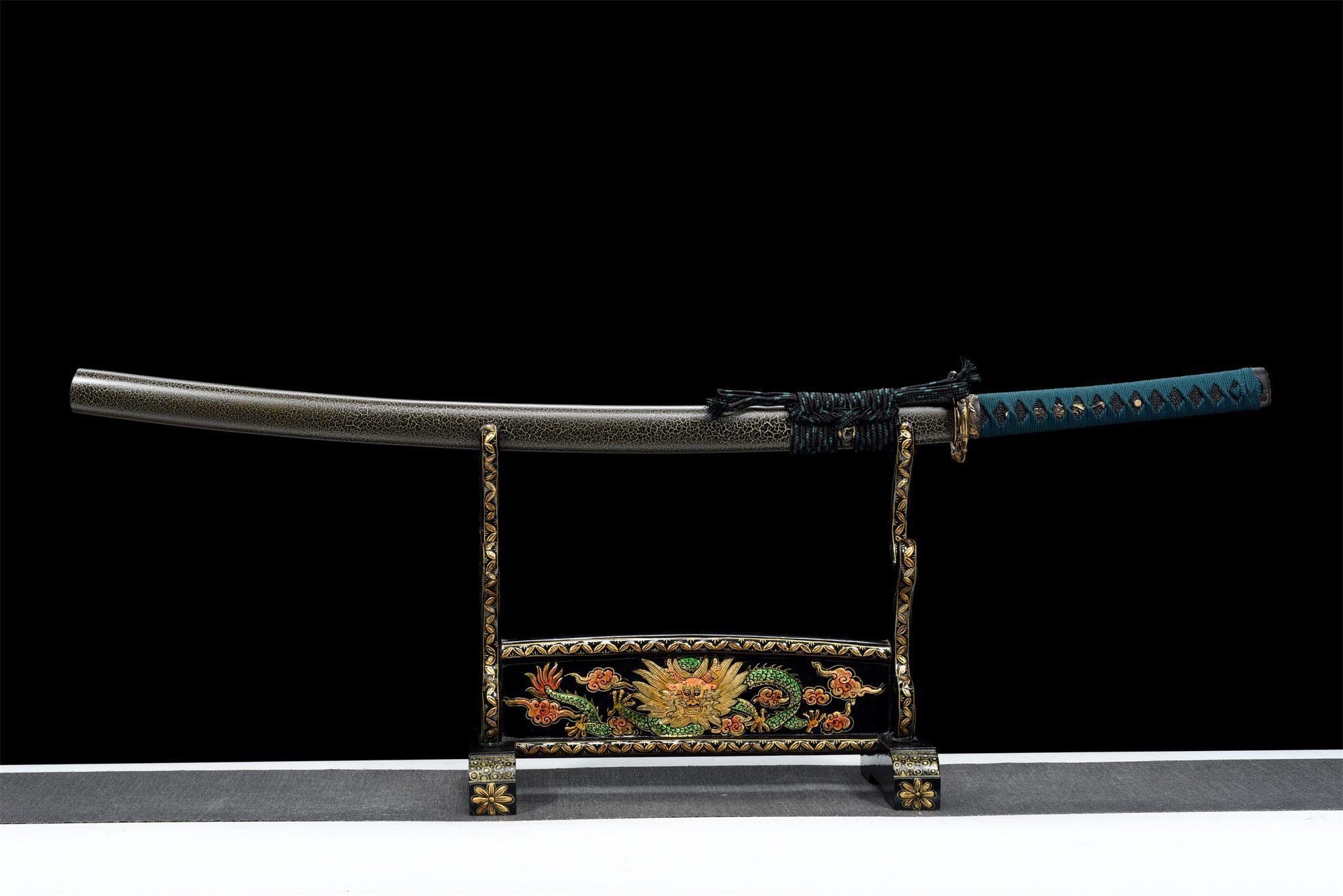Het gouden Damascus-stalen lemmet onthult hypnotiserende rimpelingen die doen denken aan slangenschubben, terwijl de gouden afwerking het licht met mystieke intensiteit vangt en weerkaatst. De afgeronde koperen tsuba is voorzien van een fijn gebeitelde slang die zich om de beschermkap kronkelt en een opmerkelijke symbolische en esthetische bescherming biedt. Het massief houten handvat, bedekt met imitatie zwart roggenleer, biedt een stevige en comfortabele grip, versterkt door een blauwe tsuka-ito-vlecht met ruitpatronen die doen denken aan reptielenschubben. De gouden menuki stellen draken voor, waardoor een dialoog ontstaat tussen mythische oosterse wezens, terwijl de gouden koperen fuchi met een gegraveerde draak dit drakenmotief compleet maakt. De massief gelakte houten schede is voorzien van geschilderde pantermotieven, die een katachtige dimensie toevoegen aan deze dierensymfonie, en is afgewerkt met een zwarte sageo die de ingetogen elegantie van het geheel benadrukt.