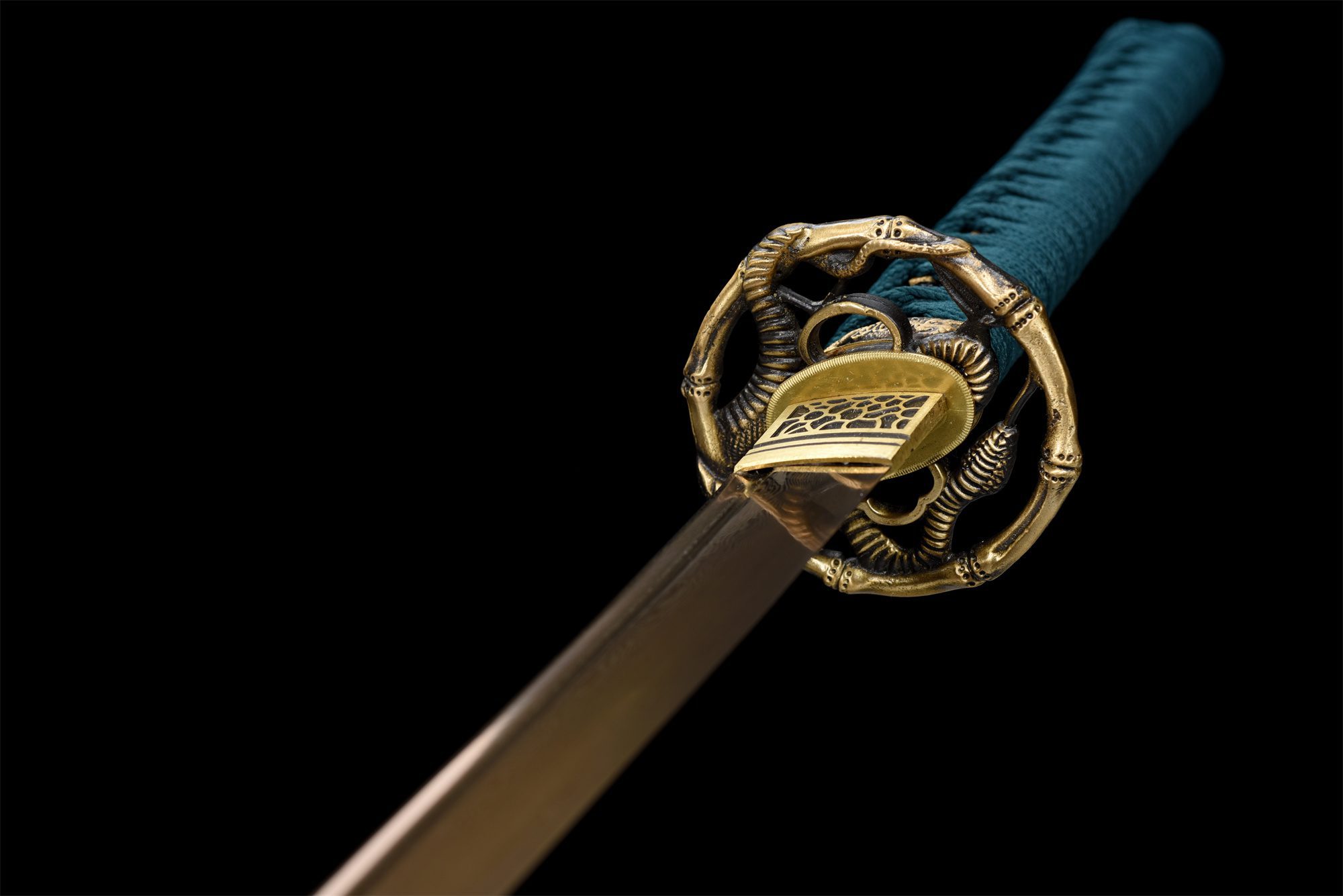 - Habaki (鎺): Verguld messing met zwarte motieven.