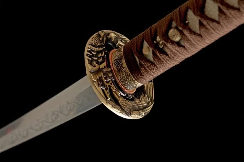 Deze katana met zijn authentieke Hamon heeft ook een messing beschermkap, met een afgeronde gouden vorm, rijkelijk gedetailleerd met adelaar- en bloemmotieven, gravures op de vergulde messing habaki en een rijk versierde fuchi. Bovendien is het handvat of Tsuka bedekt met echte witte roggenhuid en versierd met een geweven bruine Tsuka-ITO, verfraaid met bloemmotieven, wat zorgt voor een opmerkelijke visuele balans.