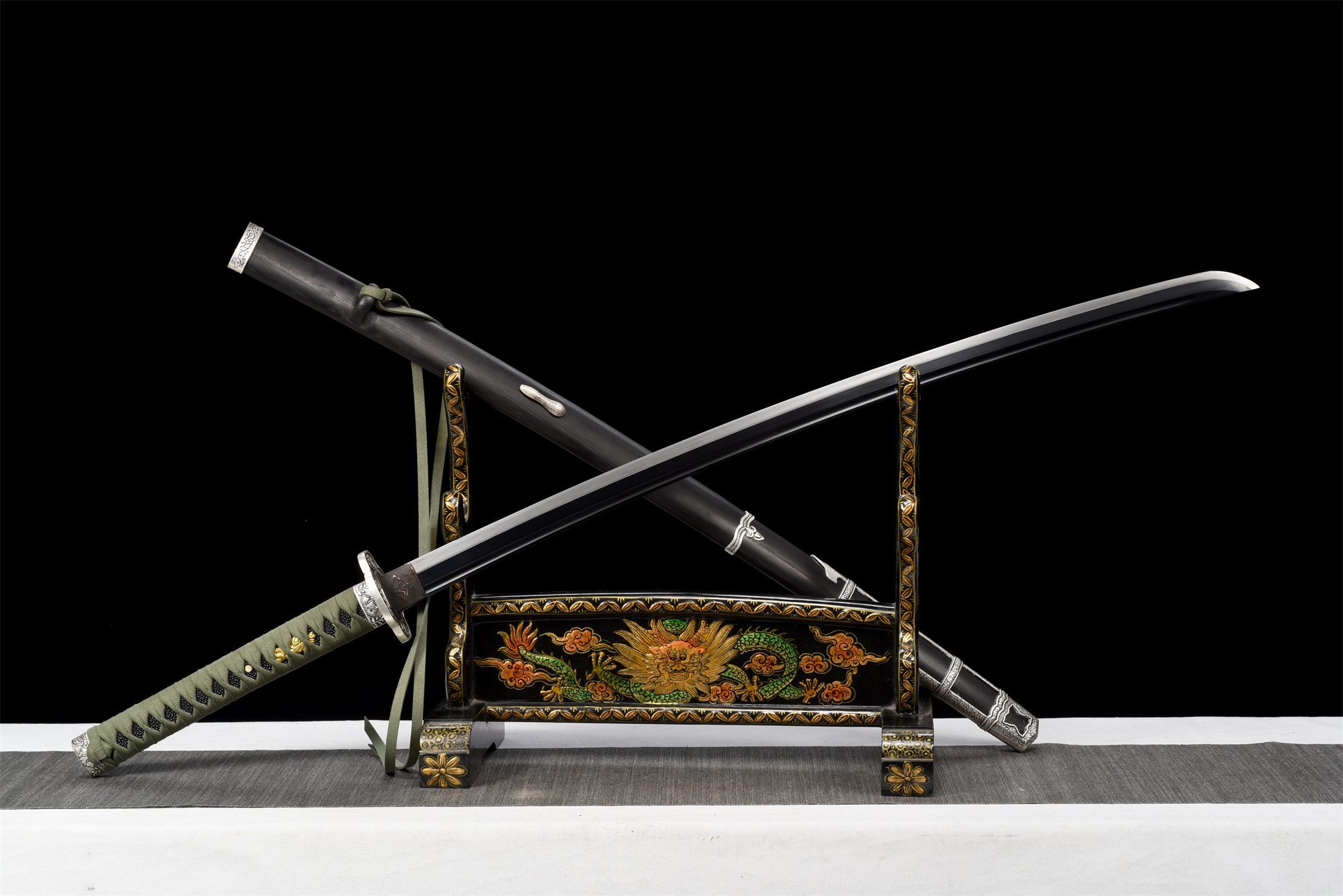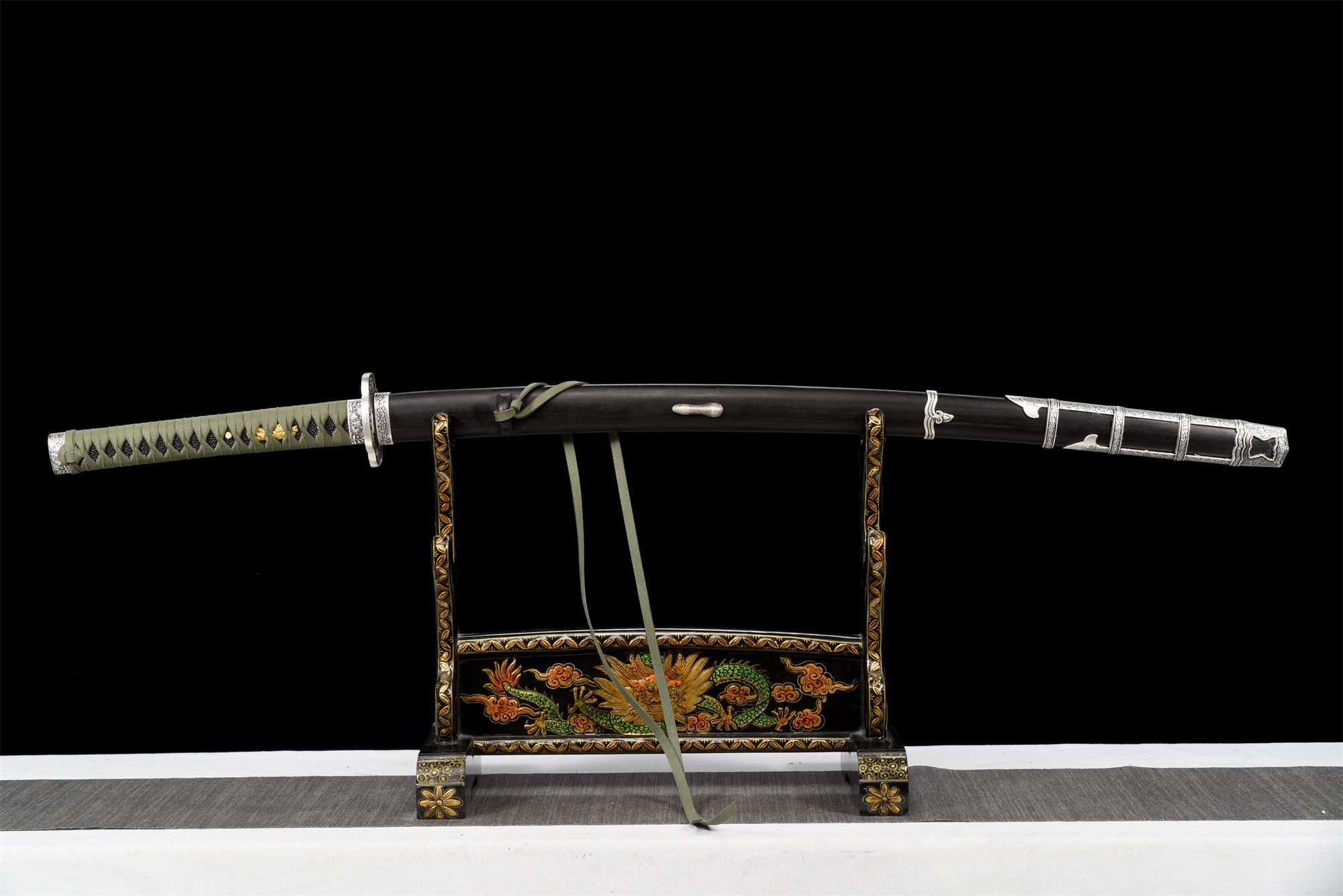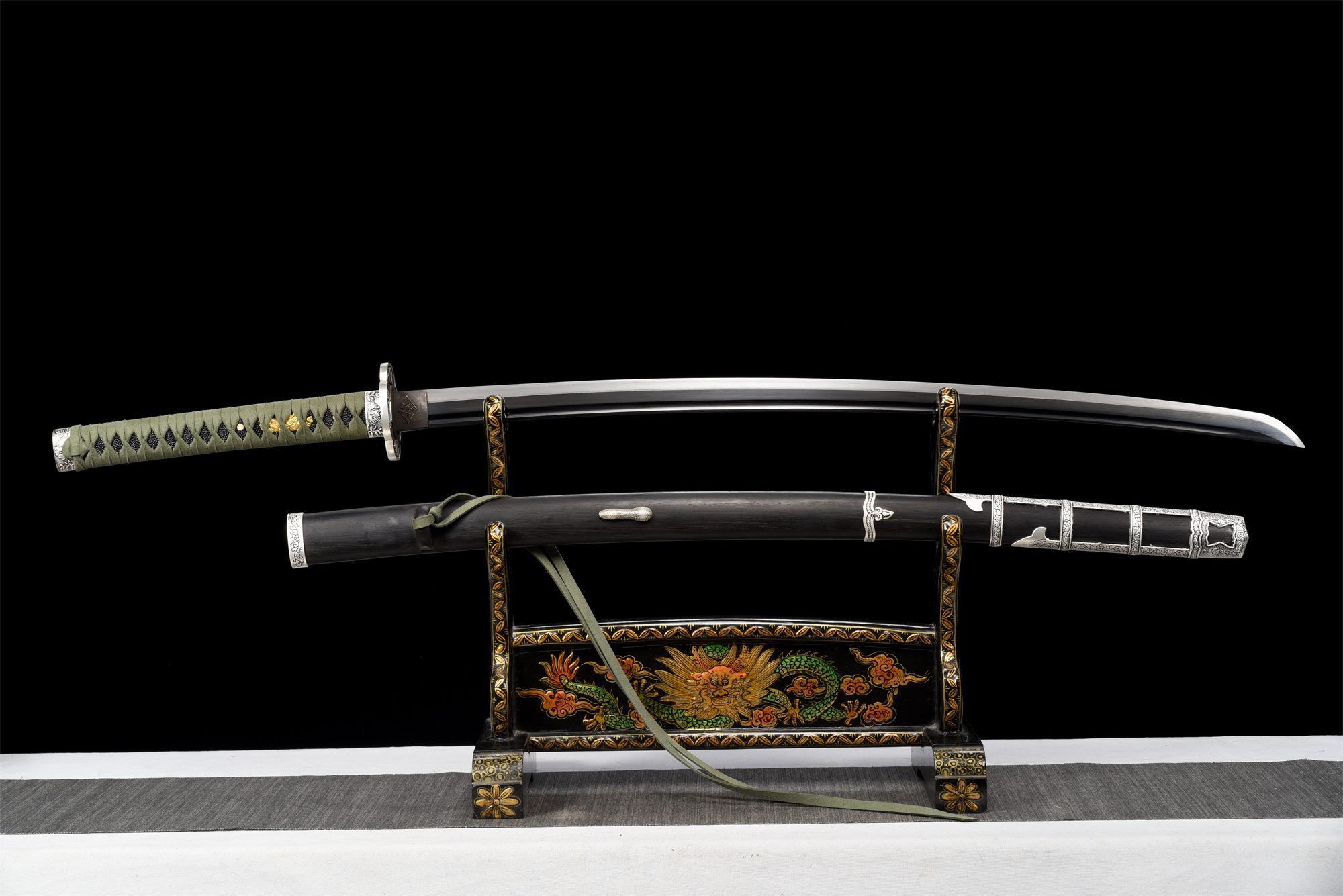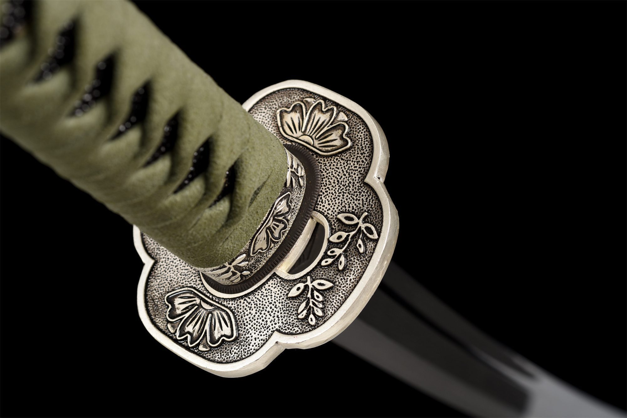 Het mangaanstalen lemmet heeft een opvallende zwarte afwerking, versterkt door een authentieke rechte hamon die is verkregen door differentiële harding, waardoor een duidelijke lijn wordt getrokken tussen de geharde snijkant en de flexibelere rug. De bo-hi die in het metaal is uitgesneden, maakt het lemmet lichter en produceert tegelijkertijd het beroemde “lied van de katana” tijdens bewegingen. De afgeronde kruisvormige tsuba, vervaardigd uit een zilverlegering, is voorzien van delicate bloemengravures die harmonieus worden herhaald op de fuchi en kashira, waardoor een opmerkelijke decoratieve consistentie ontstaat. Het handvat getuigt van nauwgezet vakmanschap met zijn zwarte basis van imitatie roggenhuid bedekt met groene tsuka-ito gevlochten in ruitpatronen, terwijl de vergulde menuki die draken voorstellen een vleugje adel toevoegen. De rozenhouten schede, met zijn verzilverde uiteinden gegraveerd met bloemmotieven die identiek zijn aan die op de beschermkap, maakt deze harmonie compleet en is voorzien van een groene ring die past bij het vlechtwerk.