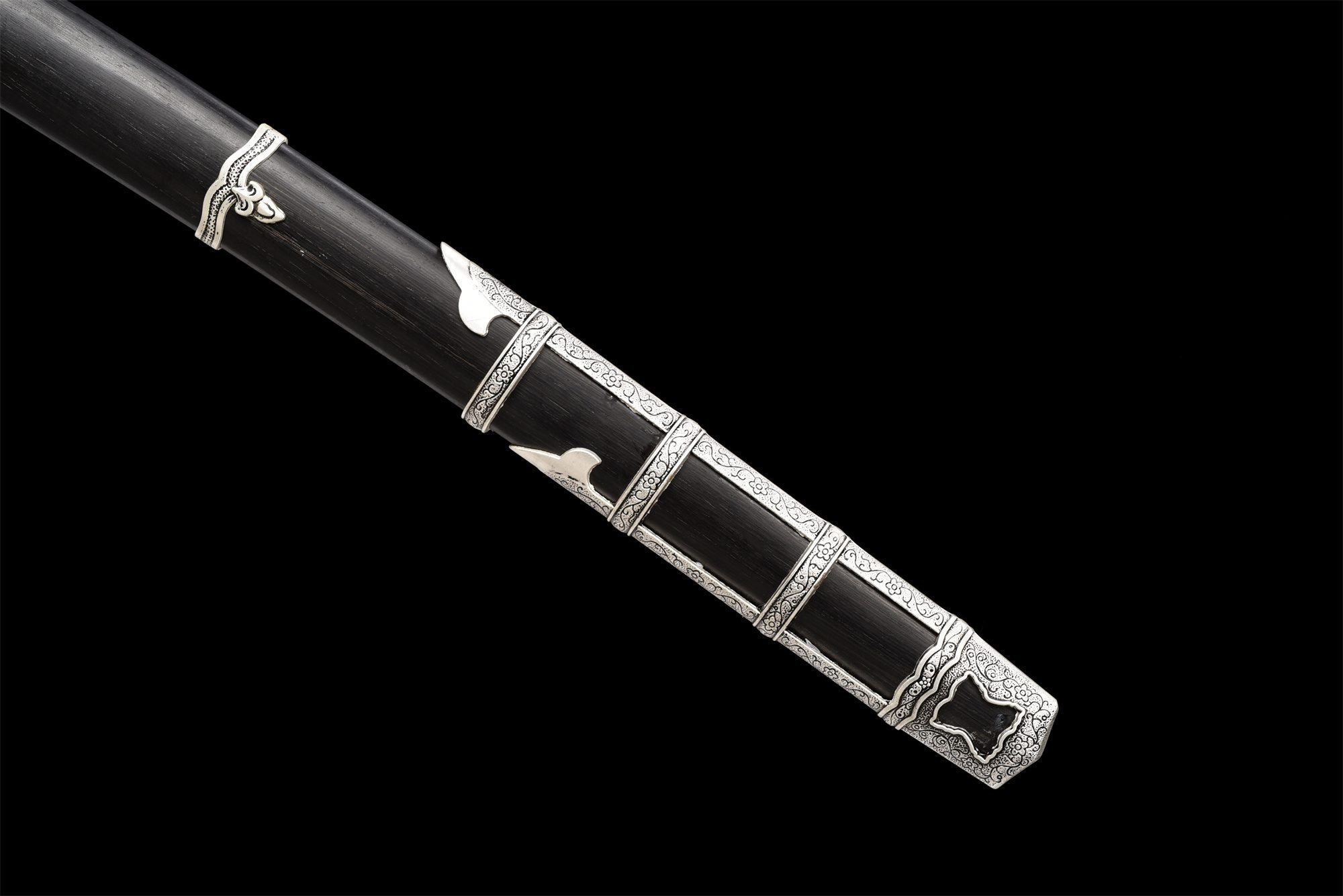 - Schede (Saya 鞘): Rozenhout met verzilverde uiteinden gegraveerd met bloemmotieven.