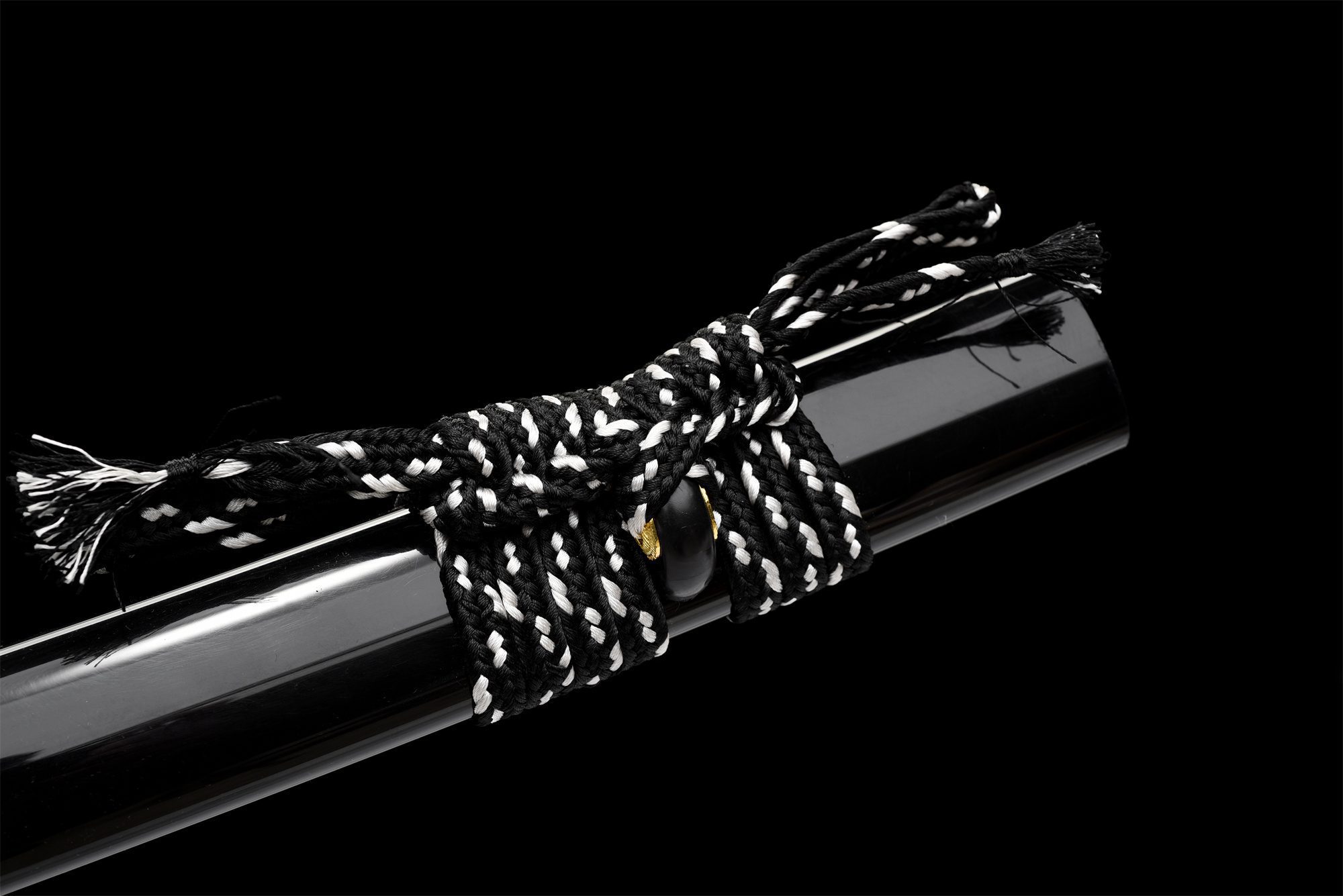 - Schede (Saya 鞘): Gemaakt van massief hout met een zwarte laklaag.