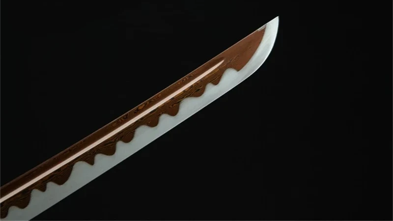 Het Hōyoku (鳳翼) of Phoenix Wing katana-zwaard combineert de heldere, vergulde kleur van messing met het rood dat elegant doet denken aan de kleur van vlammen, waardoor het de naam Phoenix Wing heeft gekregen. Het tweekleurige rode Damascus-stalen lemmet getuigt van een unieke zwaardsmid en is voorzien van een tōran hamon, verkregen door echte klei-tempering. Het lemmet wordt bewaard in een rood getinte schede die wordt vastgemaakt met een bordeauxrode en witte sageo. Het handvat is gemaakt van wit synthetisch shagreenleer, omwikkeld met een rode tsuka-ito in een ruitpatroon en versierd met een lange vergulde draak menuki, een symbool van kracht en wijsheid. De met golven gegraveerde vergulde messing beschermkap en bijpassende fuchi doen denken aan de oceaan, terwijl de gehamerde messing habaki een verfijnde finishing touch toevoegt. Deze katana belichaamt wedergeboorte en passie met zijn heldere kleuren en traditionele motieven.