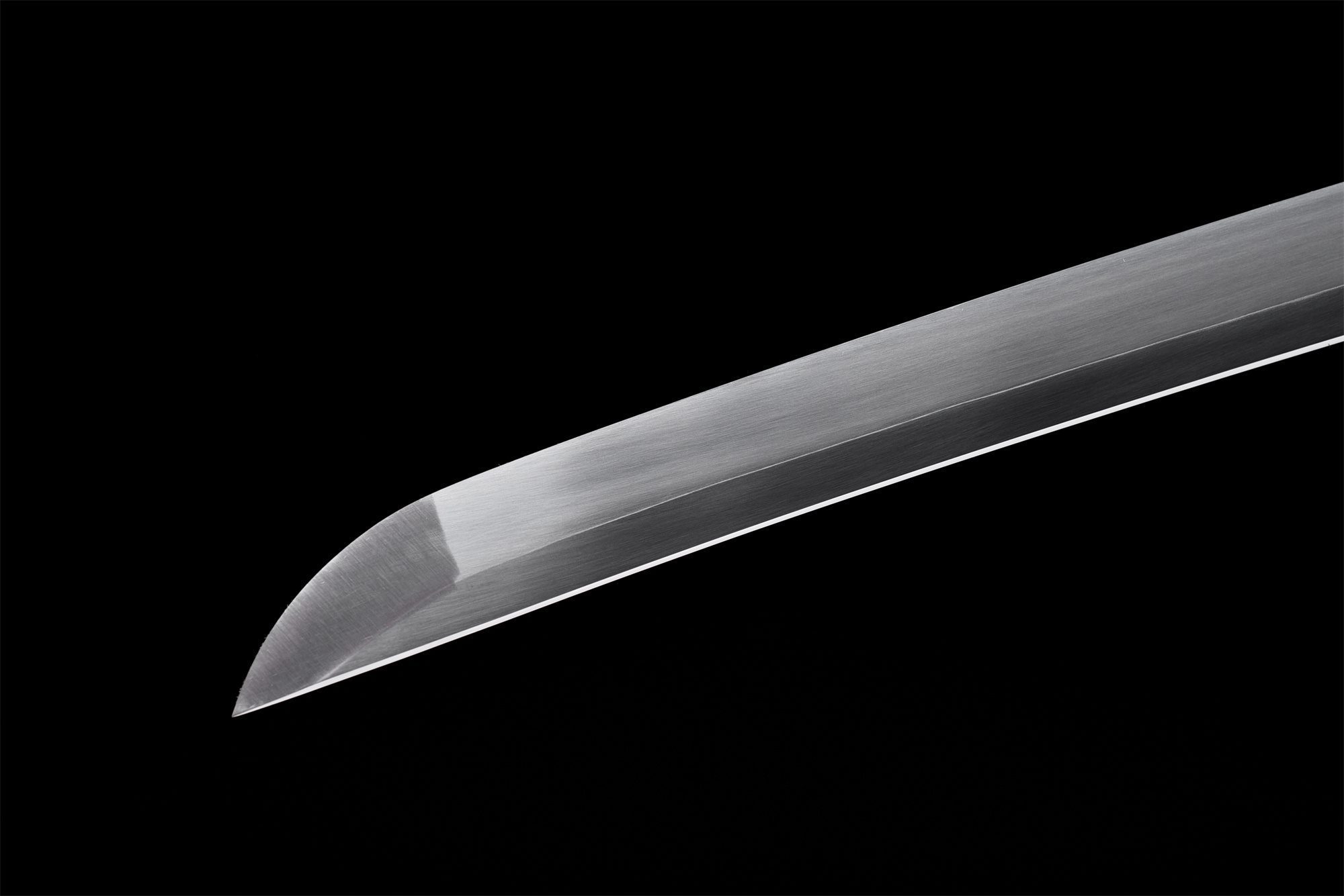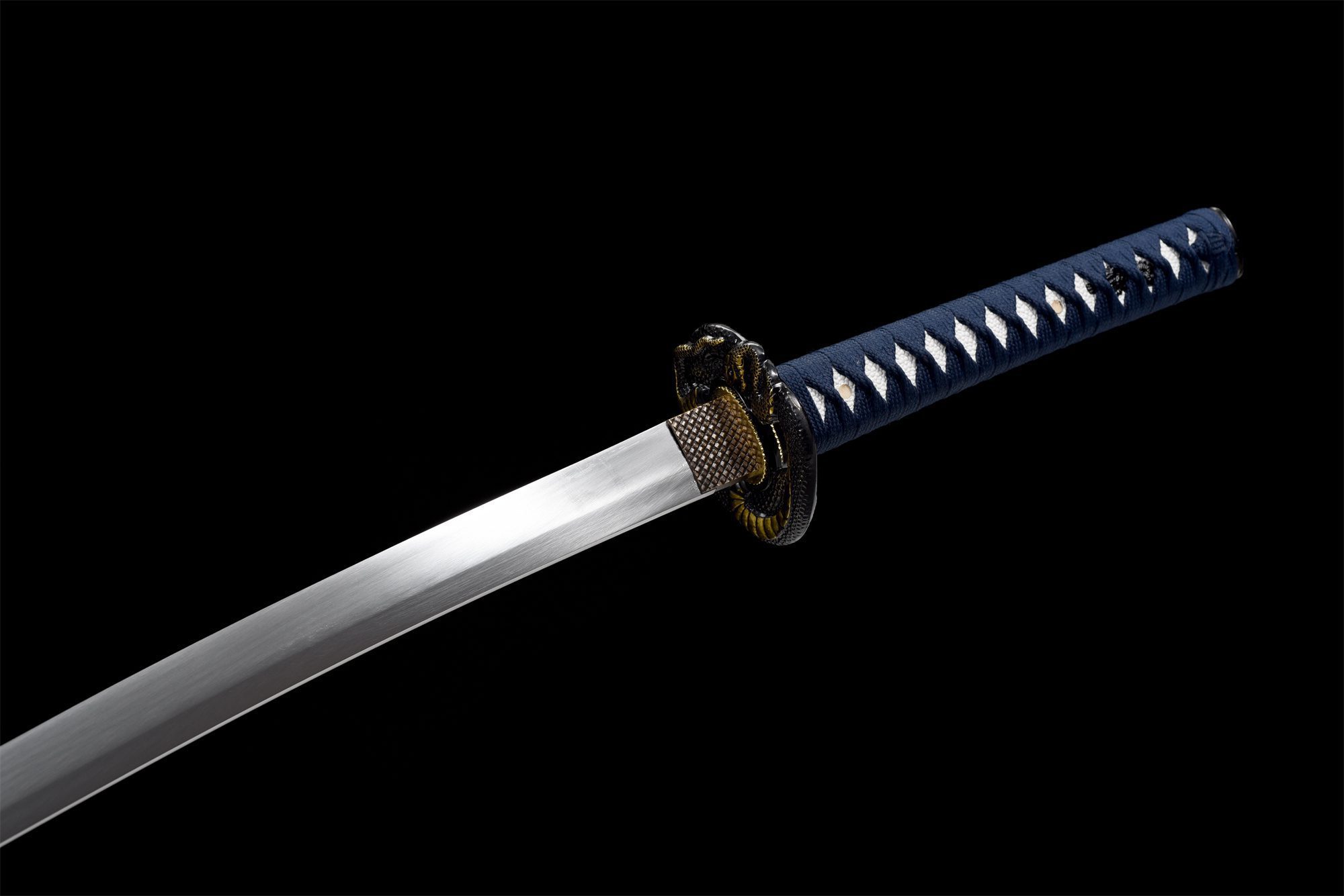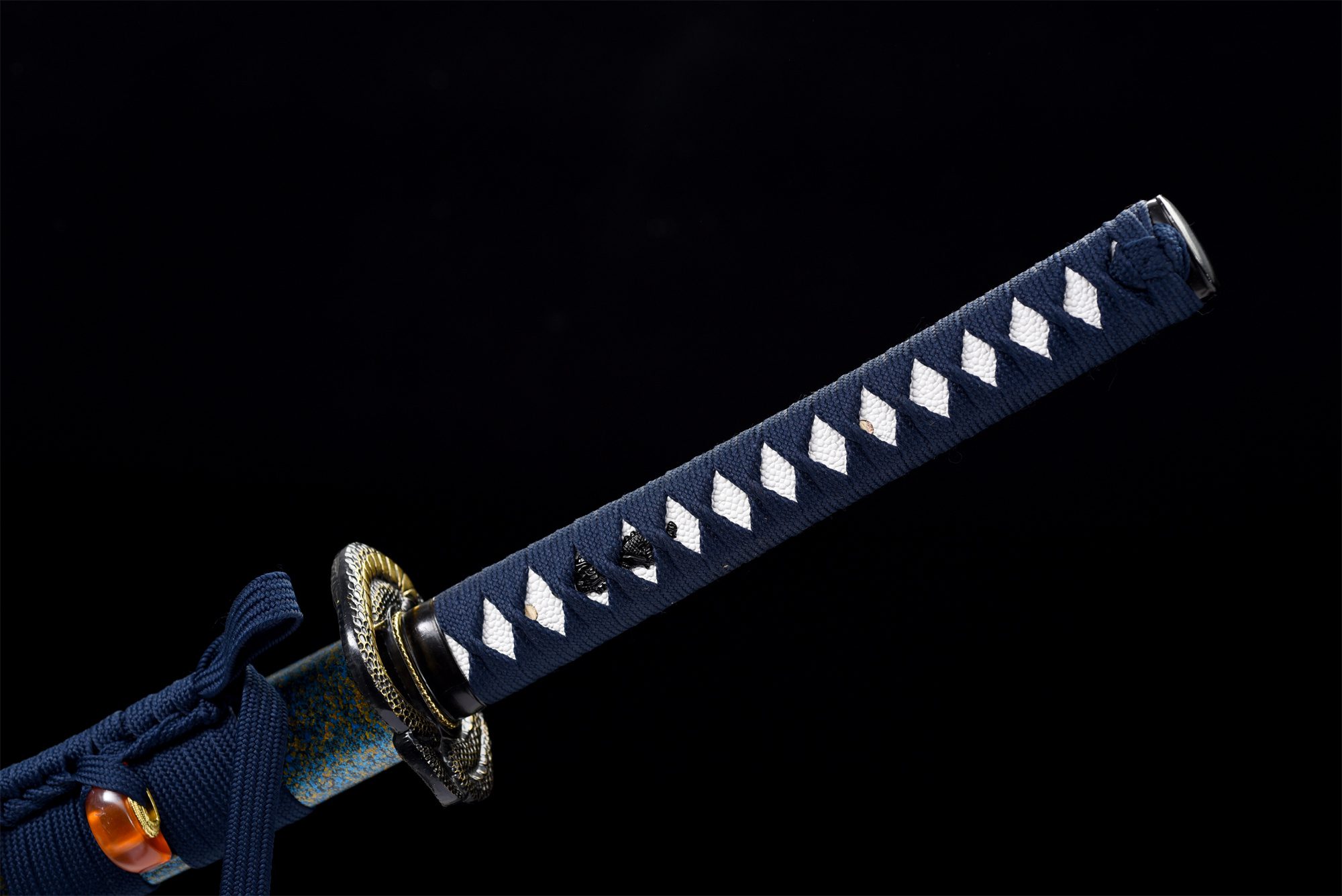 Het mangaanstalen lemmet heeft een natuurlijke staalkleur die het licht subtiel vangt, terwijl de zwarte habaki met gegraveerde slangenschubben een harmonieuze overgang naar de pareerstang vormt. De ronde tsuba van koperlegering valt op door zijn artistieke weergave van een opgerolde zeeslang, met opmerkelijk beitelwerk. Het handvat combineert op elegante wijze imitatie wit roggenleer en hout, versterkt door blauwe tsuka-ito-vlechtwerk in een ruitpatroon dat doet denken aan oceaangolven. De menuki stellen een zwarte draak voor, die een visuele dialoog aangaat met het slangenthema, terwijl de gladde zwarte fuchi en kashira van legering zorgen voor een verfijnde afwerking. De gelakte houten schede is voorzien van een hemelsblauwe en gouden korrelschildering die de essentie van de diepten van de oceaan weergeeft, aangevuld met een blauwe sageo met een oranje bevestiging die doet denken aan de kleuren van de zonsondergang boven de oceaan.