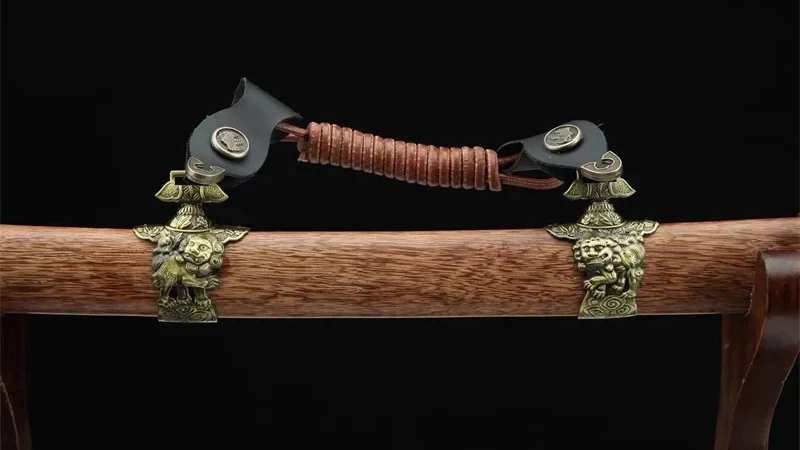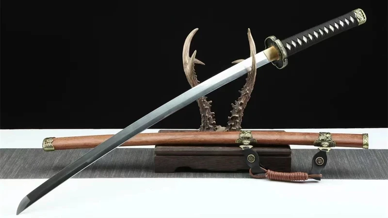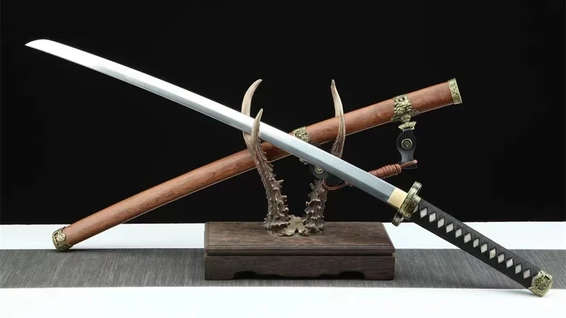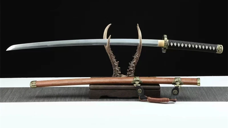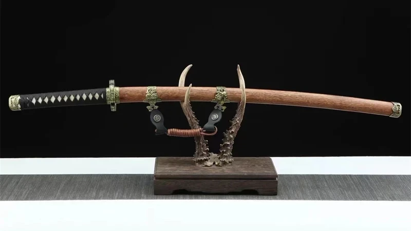Het Kazekiri (風切) of windsnijder katana-zwaard heeft een vlijmscherp Damascus-stalen lemmet met een authentieke midare-vormige klei-hamon. De rozenhouten saya, gesublimeerd door gegraveerde gouden ringen op de uiteinden, is nobel en traditioneel. De tsuka, gemaakt van echt wit roggenleer, omwikkeld met zwart tsuka-ito in een ruitpatroon, biedt een stevige grip. De kruisvormige beschermkap, met zijn vergulde, gegraveerde contouren, is voorzien van zwarte bloemmotieven die harmonieus overvloeien in de bijpassende fuchi. De vergulde kashira-versterking en de gladde messing habaki maken dit meesterwerk compleet. De naam Kazekiri verwijst naar de kracht en precisie van het lemmet, dat zelfs de kleinste moleculen in de lucht kan doorsnijden.