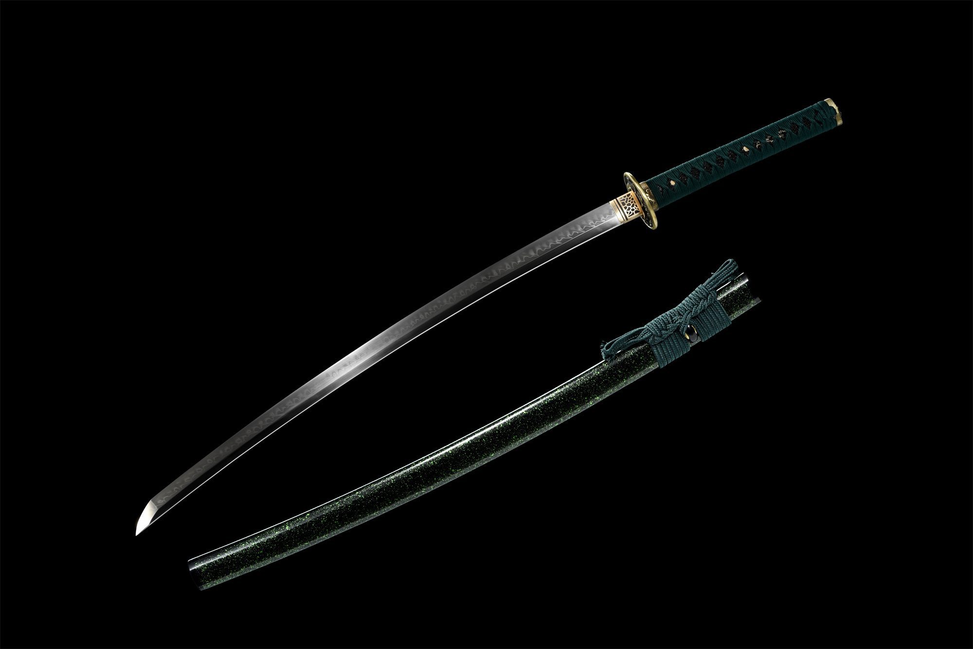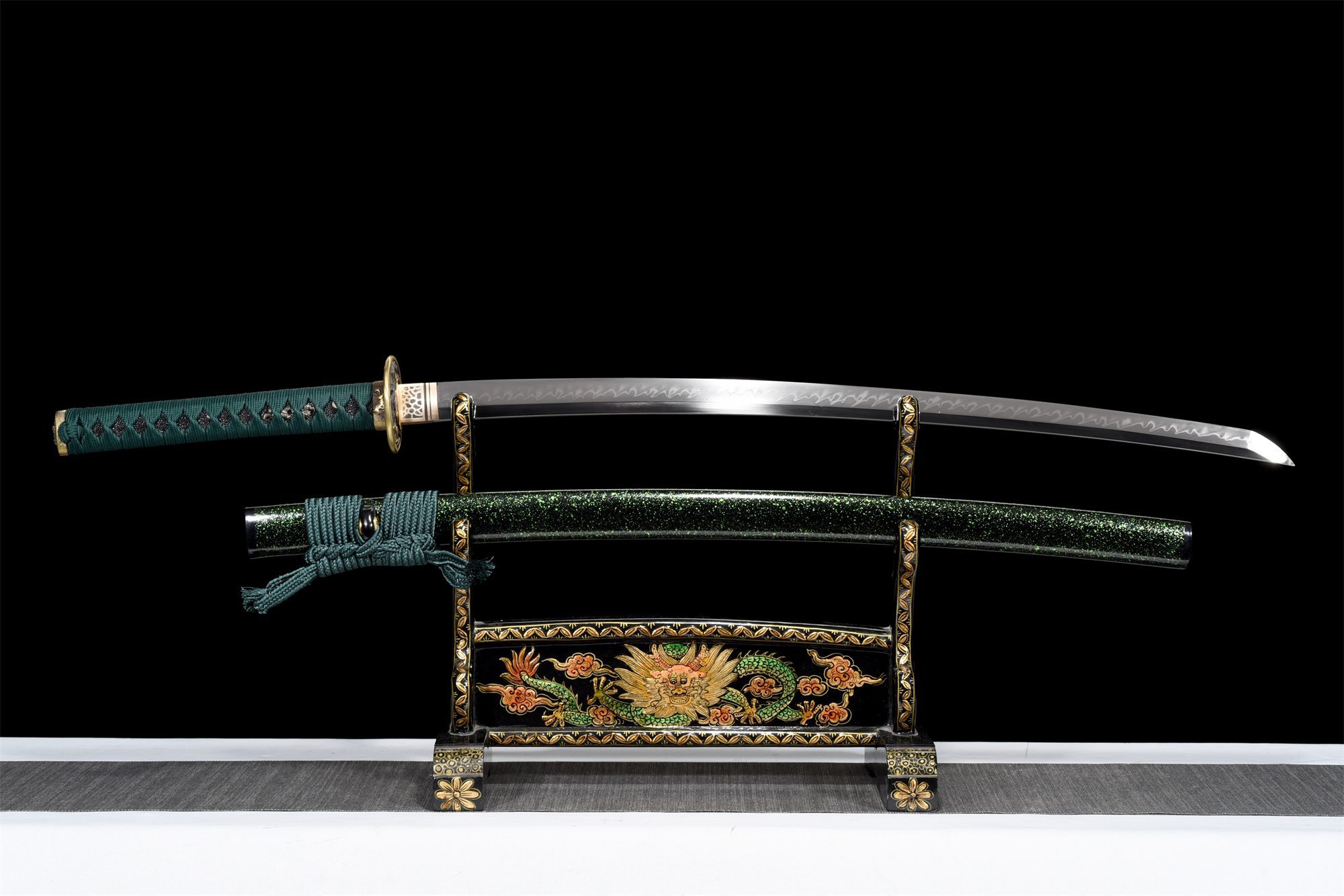 Het T10-stalen lemmet heeft een gepolijst oppervlak dat een prachtige midare hamon met natuurlijke golvingen onthult, het bewijs van authentieke differentiële harding. De afgeronde koperen tsuba is voorzien van delicate gravures van paarden die verwijzen naar de naam van het wapen. Het handvat combineert authentieke roggenhuid met groene vlechtwerk in ruitpatroon, terwijl de zwarte menuki een elegante eenvoud toevoegen. De gehamerde koperen fuchi en kashira reproduceren ruitermotieven met opmerkelijk vakmanschap. De korrelige gelakte houten schede combineert op subtiele wijze zwart en groen, aangevuld met een echte hoorn koiguchi en een groene sageo die het geheel verenigt.