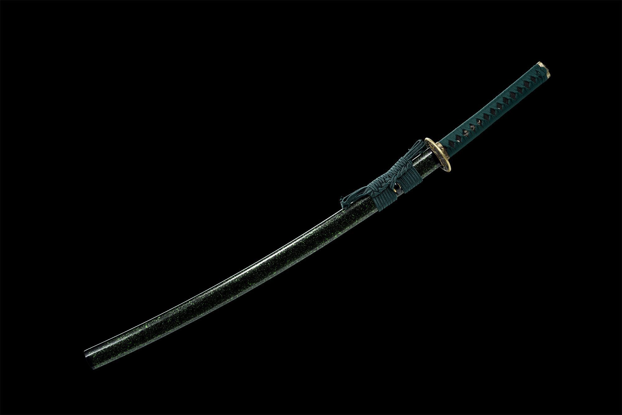 - Schede (Saya 鞘): Zwart en groen korrelig gelakt hout, authentiek hoorn Koiguchi.