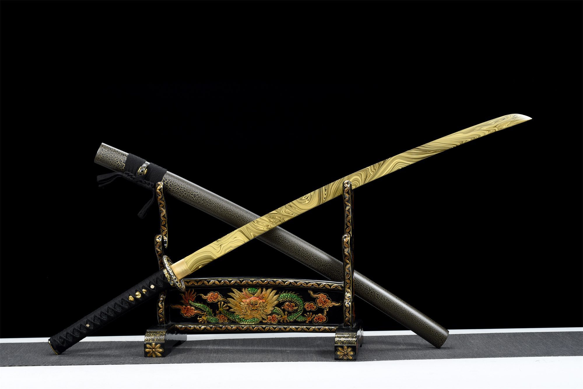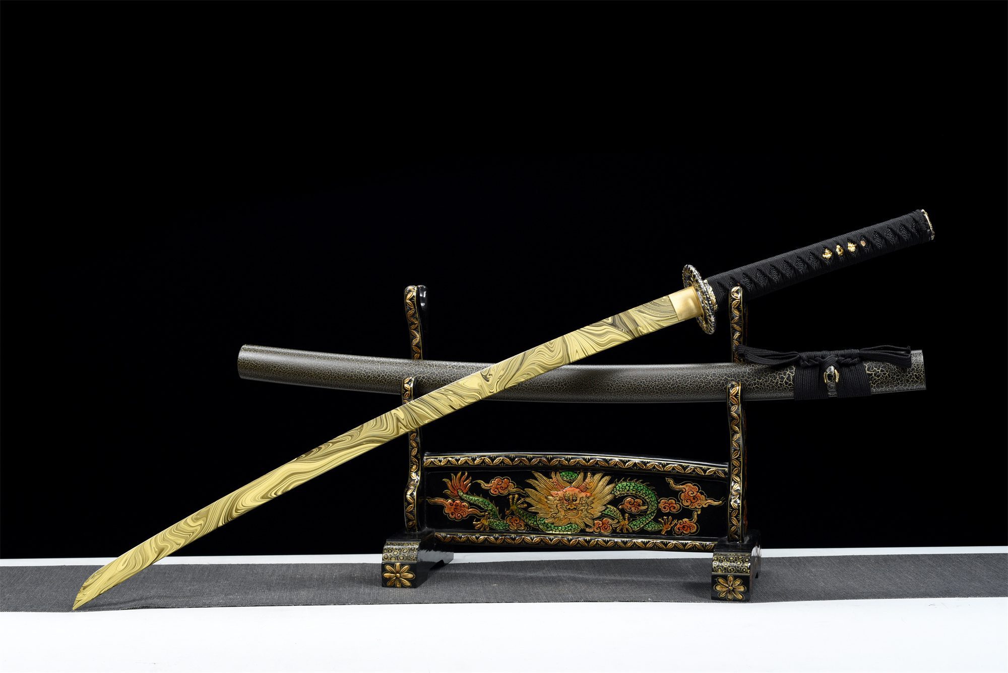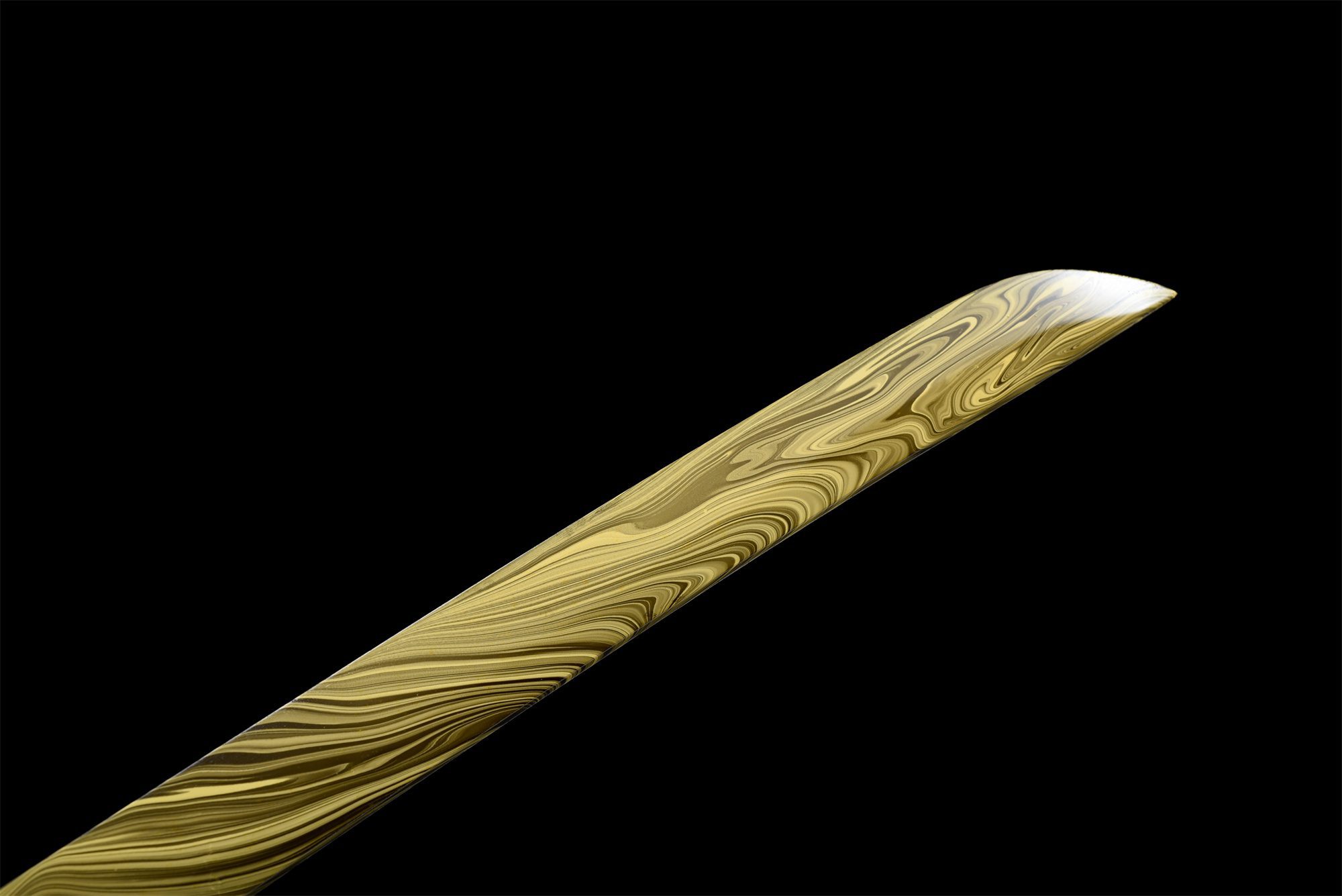 Het mangaanstalen lemmet heeft een opvallend geel patroon dat over de hele lengte golft en gouden reflecties creëert die dansen in het licht. Deze unieke kleuring is het resultaat van een speciale behandeling die het staal zijn warme tinten geeft met behoud van zijn sterkte. De afgeronde pareerstang (tsuba) combineert op harmonieuze wijze diepzwarte en gouden accenten, wat een opvallend contrast vormt met de fijn bewerkte koperlegering. Het handvat (tsuka) combineert massief hout met zwarte roggenhuid (samegawa), verweven met zwart vlechtwerk (tsuka-ito) met ruitpatronen. De gouden menuki stellen een draak voor, die kracht en wijsheid symboliseert, terwijl de gouden fuchi en kashira voorzien zijn van delicate bloemengravures. De massief houten schede (saya) is beschilderd met een gegraveerd pantermotief, dat de kracht en behendigheid van het roofdier oproept.