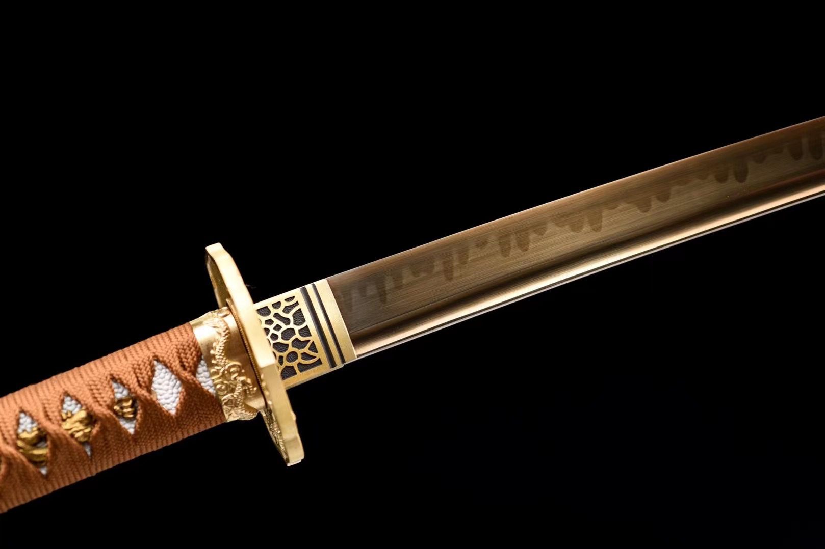 Het T10-stalen lemmet van het Kōkiba katana-zwaard heeft een uitzonderlijke koperkleurige tint die het licht op hypnotiserende wijze vangt en weerkaatst. De authentieke hamon, verkregen door differentiële harding, vormt een golvende lijn die gebieden met verschillende hardheden van elkaar scheidt, waardoor een opvallend visueel contrast ontstaat op dit gouden oppervlak. De bo-hi holt de achterkant van het lemmet op elegante wijze uit, waardoor de structuur lichter wordt en het karakteristieke fluitende geluid ontstaat wanneer het wordt bewogen. De gouden legering van de beschermkap (tsuba) is voorzien van een draak, een motief dat harmonieus wordt herhaald op de fuchi, terwijl de kashira de handgreep bekroont met een majestueuze drakenkop. Het handvat onthult de authentieke textuur van witte roggenhuid (samegawa) onder bruine diamantvormige vlechtwerk, geaccentueerd met gouden menuki die draken voorstellen. De schede verrast met zijn transparante afwerking die de natuurlijke schoonheid van het ruwe hout onthult, omlijst door contrasterende zwarte uiteinden en een tweekleurige zwarte en koperkleurige sageo.