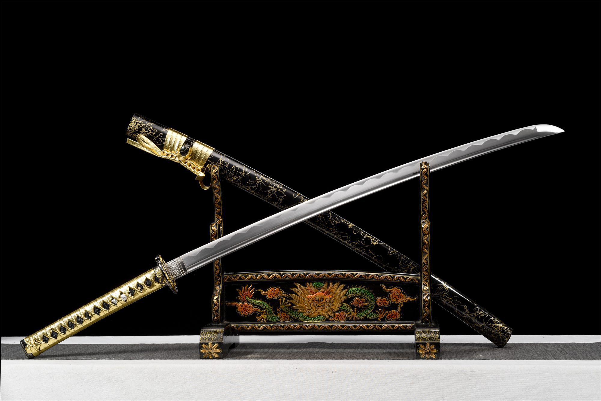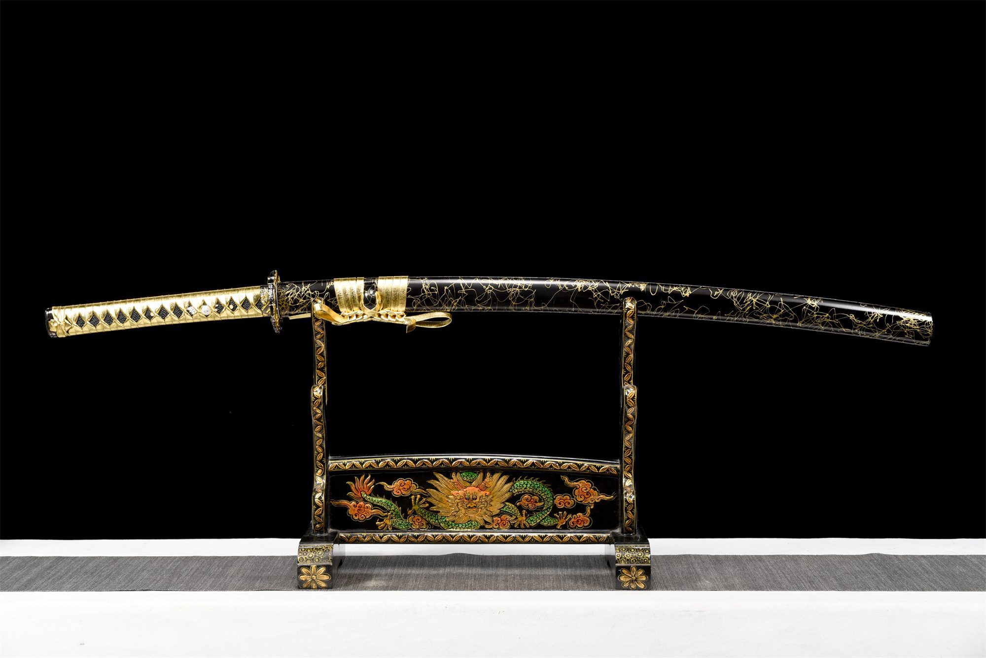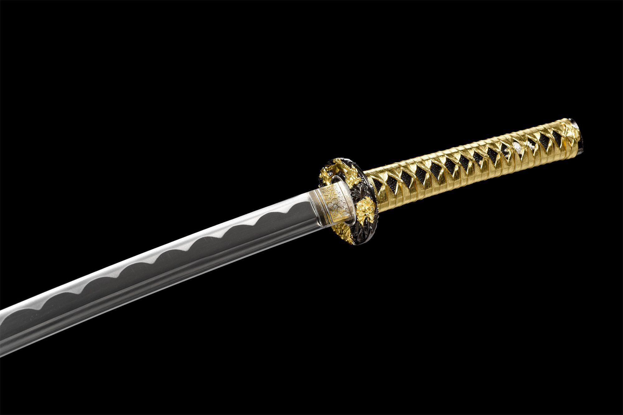 Het 1060 stalen lemmet heeft een diepzwarte kleur die prachtig contrasteert met de authentieke hamon notare die wordt verkregen door differentiële harding. De bo-hi holt het oppervlak van het lemmet op elegante wijze uit en combineert functionaliteit met esthetiek. De afgeronde tsuba in zwart en goudlegering is voorzien van delicate bloemmotieven en een majestueuze leeuw, die moed en adel symboliseert. Het handvat (tsuka) combineert op harmonieuze wijze zwart imitatie roggenleer met goudkleurig leer dat in regelmatige ruitvormen is gevlochten, terwijl de zilveren menuki een extra vleugje verfijning toevoegen. De fuchi en kashira sluiten aan bij de bloemmotieven van de beschermkap in dezelfde zwart-gouden afwerking, waardoor een perfecte visuele consistentie ontstaat. De zwart-goudgelakte schede past perfect bij het geheel en wordt aangevuld met een gouden sageo die de elegantie van dit stuk benadrukt.