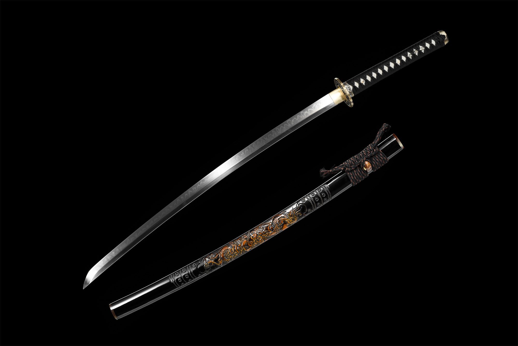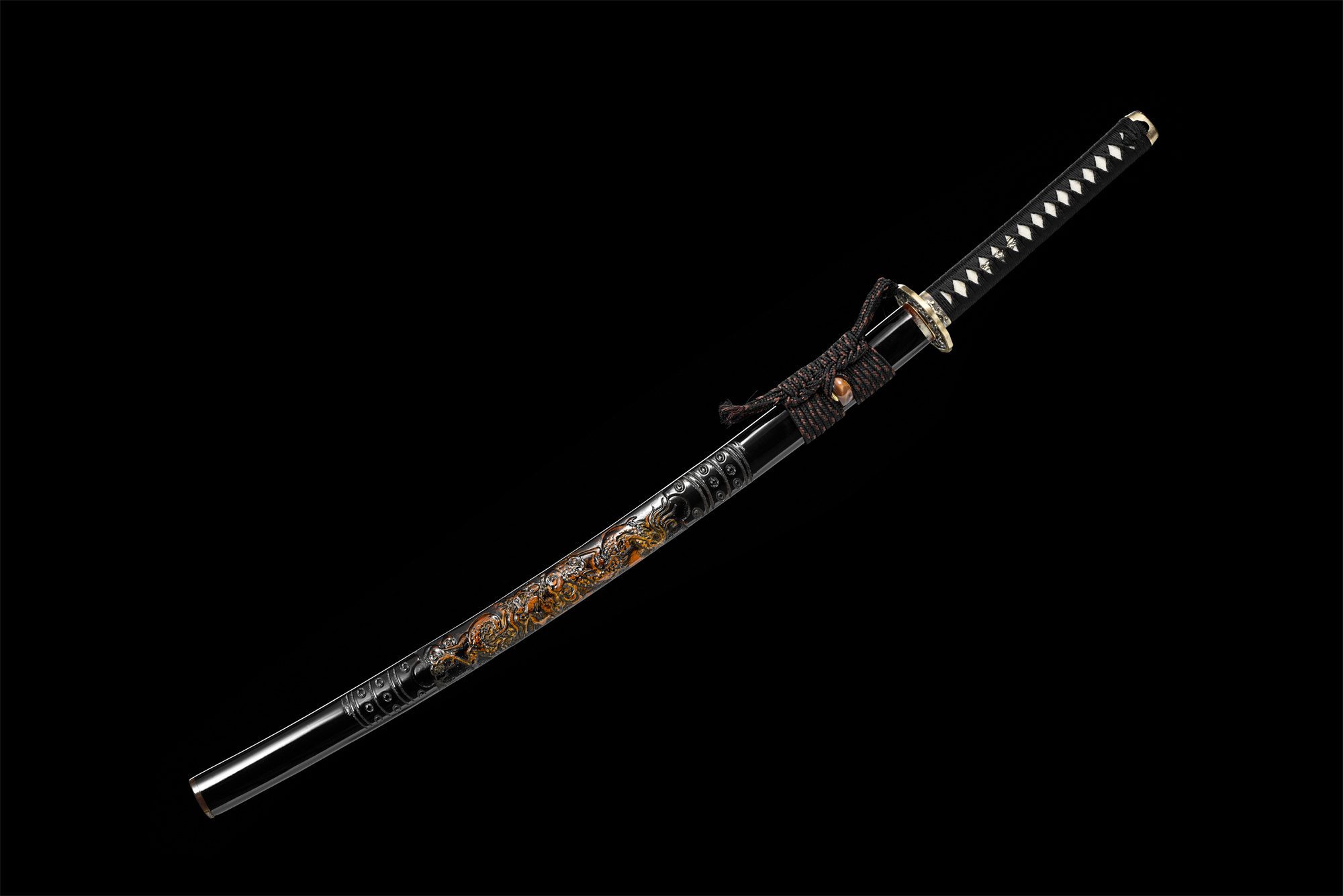 - Schede (Saya 鞘): Zwart gelakte hardhouten saya, versierd met een draak in reliëf.