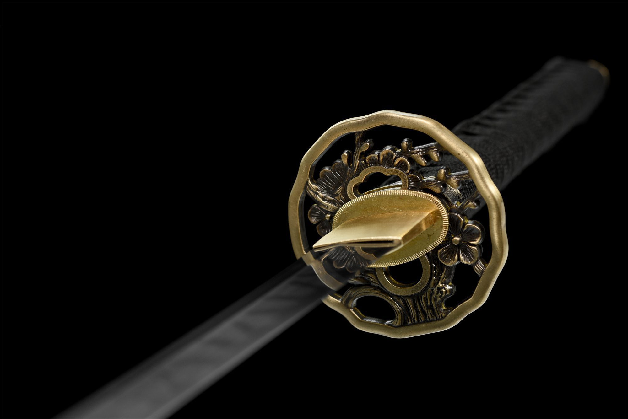- Bescherming (Tsuba 鍔): Vergulde koperen ronde tsuba, gesneden en opengewerkt met bloemmotieven, voorzien van hitsu-ana voor kogatana en kōgai.