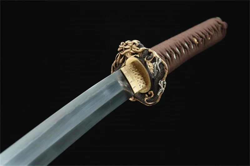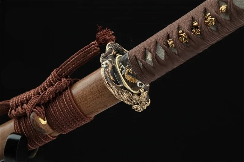 - Tsuba (鍔): verguld en verzilverd, rijkelijk gegraveerd met een opgerolde draak.