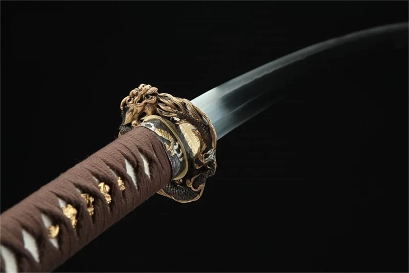 Het Noboru katana-zwaard, dat symbool staat voor ascensie, heeft een T10-stalen lemmet dat bekend staat om zijn sterkte en duurzaamheid. Het lemmet is versierd met een rechte Suguha hamon, die de uitmuntendheid van klei-tempering weerspiegelt. De schede is gemaakt van hoogwaardig ruw hout, met een zwarte Koiguchi. Het handvat van echt wit roggenleer is voorzien van een bruine Ito in een ruitpatroon, wat zorgt voor een elegante en comfortabele grip. De menuki zijn draakvormig en verguld. De afgeronde pareerstang, rijkelijk gegraveerd met een opgerolde draak, is verguld en verzilverd, net als de bijpassende Fuchi en Kashira. De gekeurde messing habaki maakt dit verfijnde katana met de naam Ascension compleet.