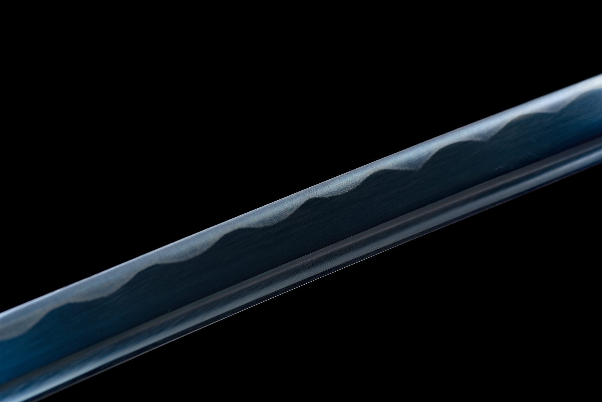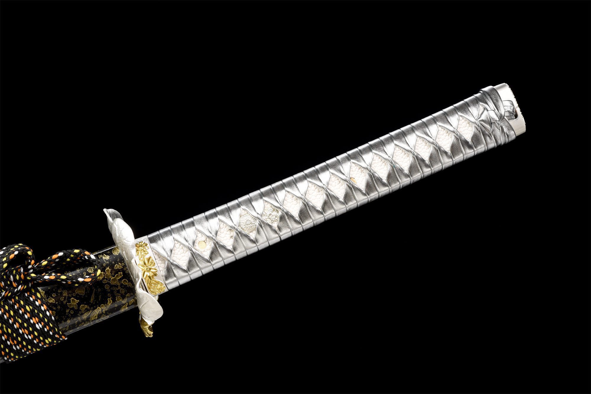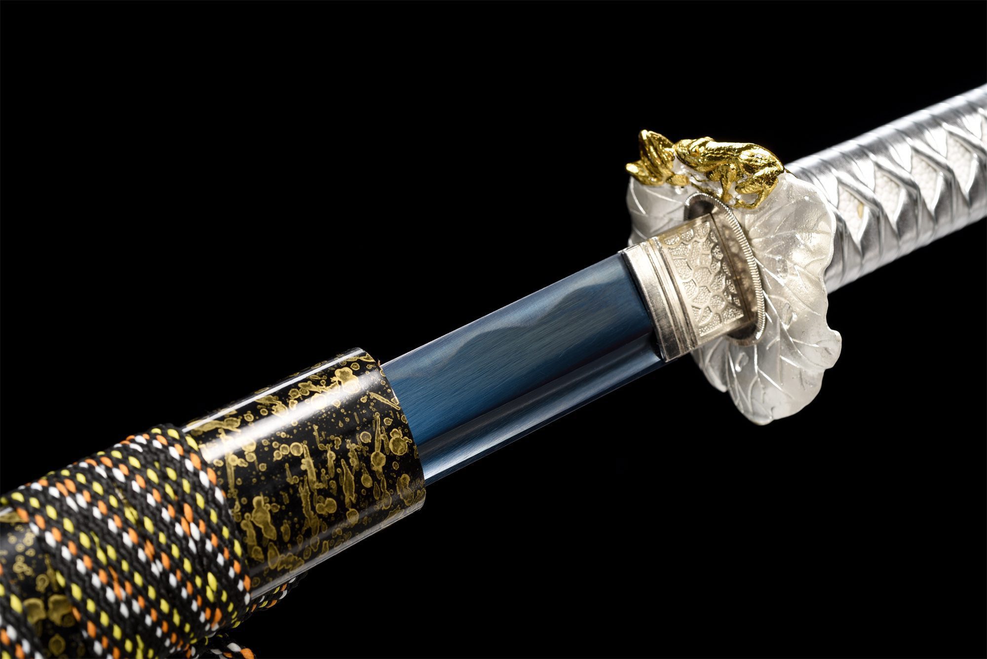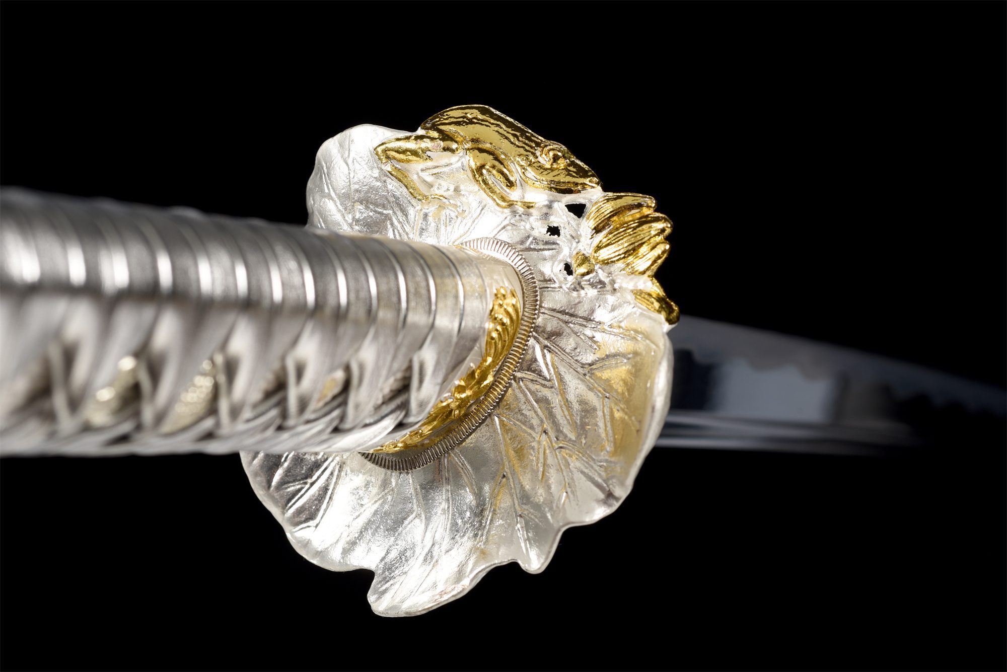 Het 1060 stalen lemmet heeft een kenmerkende blauwe tint die het licht vangt als het oppervlak van een rustige vijver, terwijl de authentieke hamon notare subtiele golven creëert langs de snede dankzij traditionele differentiële harding. De bo-hi verlicht het lemmet en produceert een karakteristiek fluitend geluid tijdens beweging. De tsuba-bescherming heeft de vorm van een zilveren blad met een gouden pad erin, een symbool van welvaart en transformatie in de Japanse cultuur. Het tsuka-handvat combineert witte roggenhuid met zilveren kunstleer in een ruitpatroon, wat zorgt voor een stevige en elegante grip. De zilveren fuchi- en kashira-ornamenten zijn versierd met gouden bloemen die doen denken aan kersenbloesems, terwijl de zwartgelakte houten saya-schede is versierd met gouden waterdruppels die schitteren als sterren.