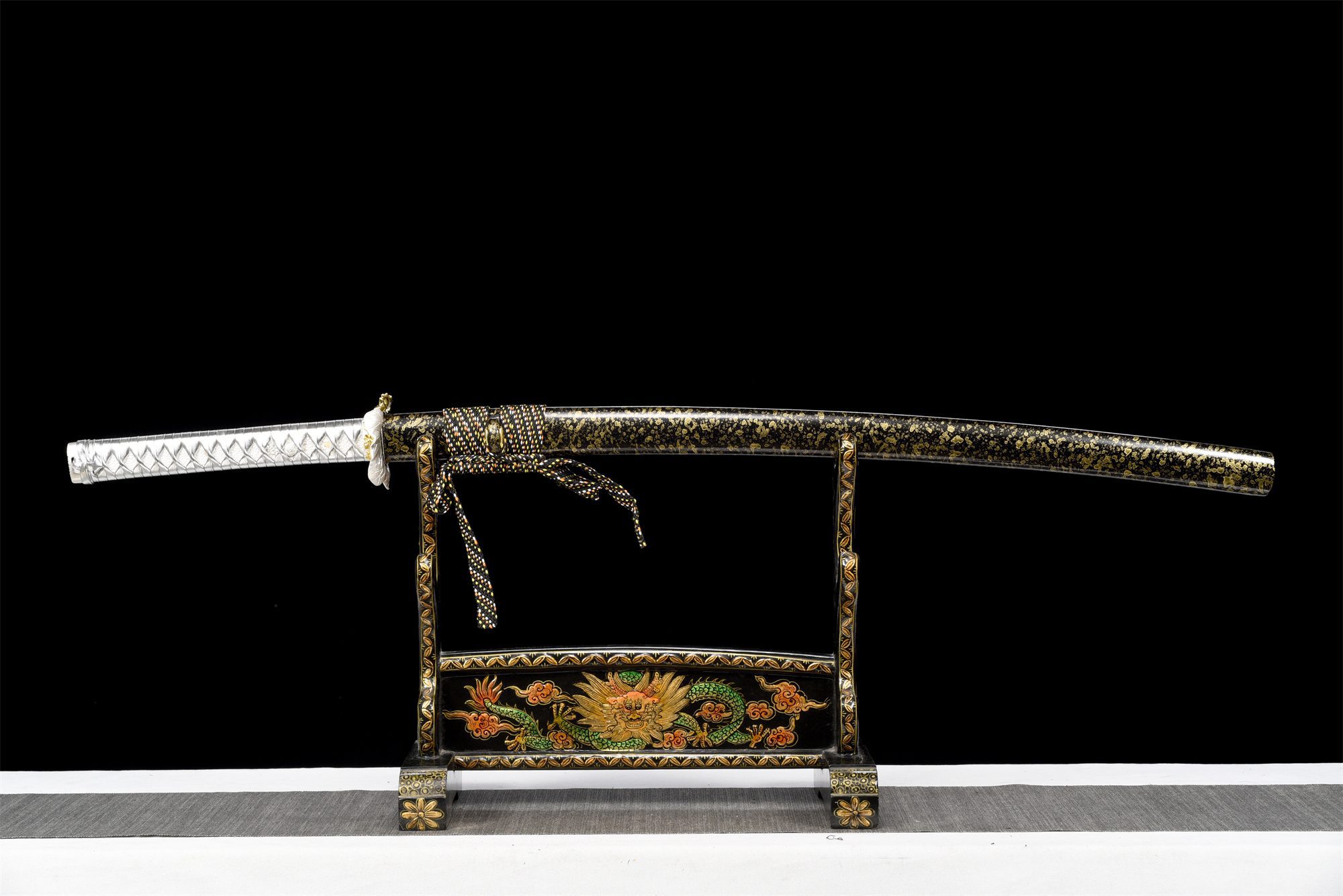 - Schede (Saya 鞘): Zwart gelakt hout versierd met gouden waterdruppels.