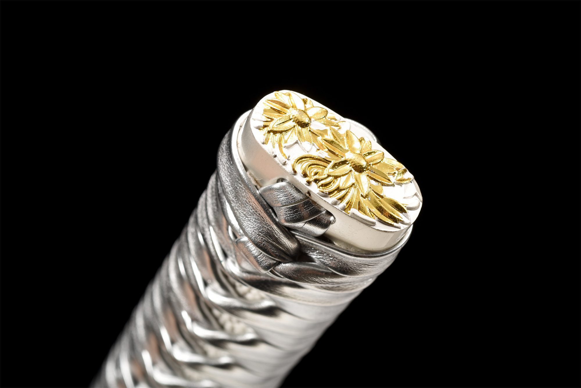 - Kashira (頭): Zilveren legering versierd met gouden bloemen.