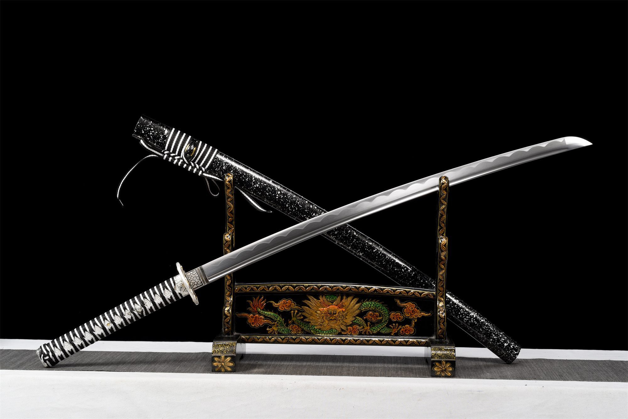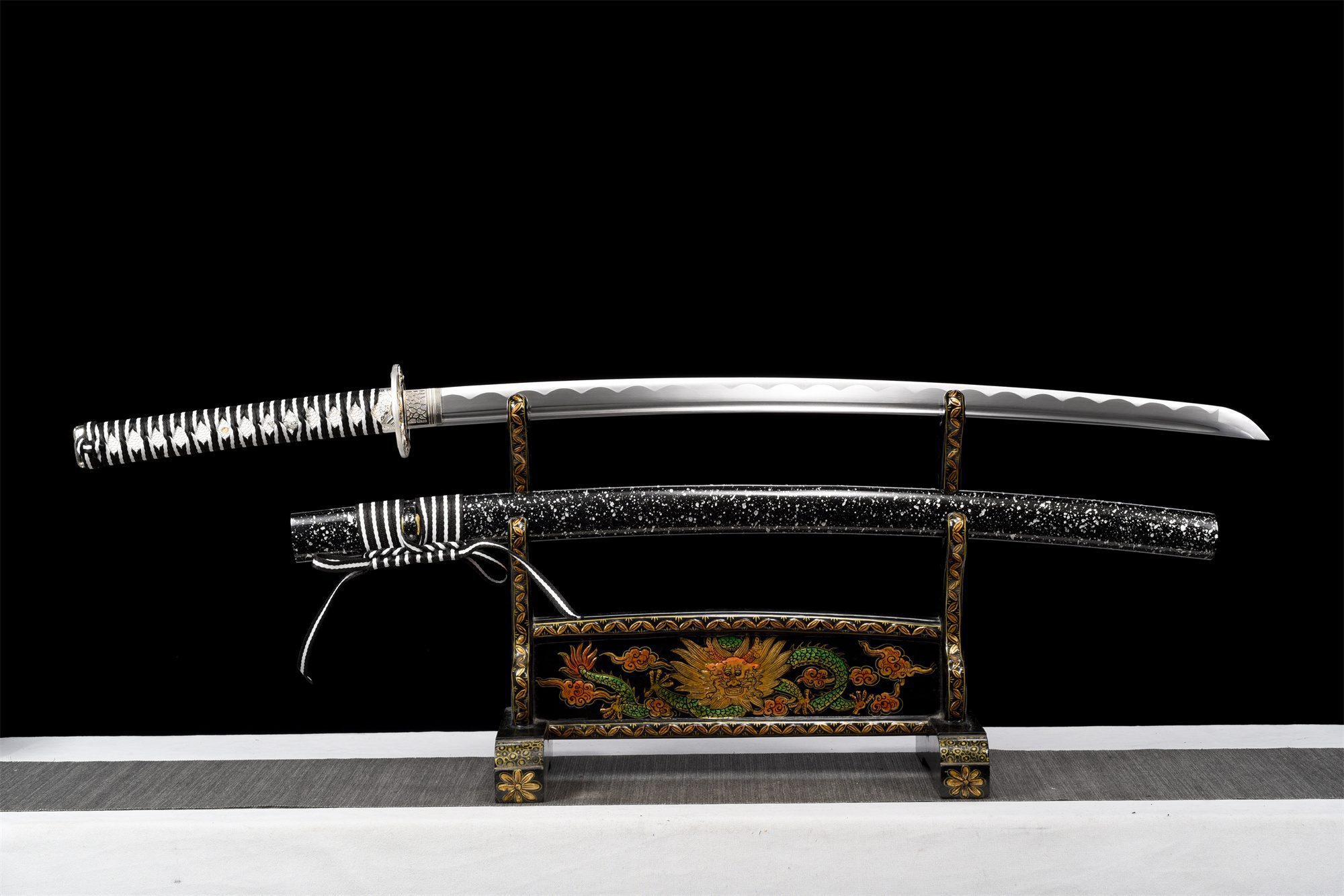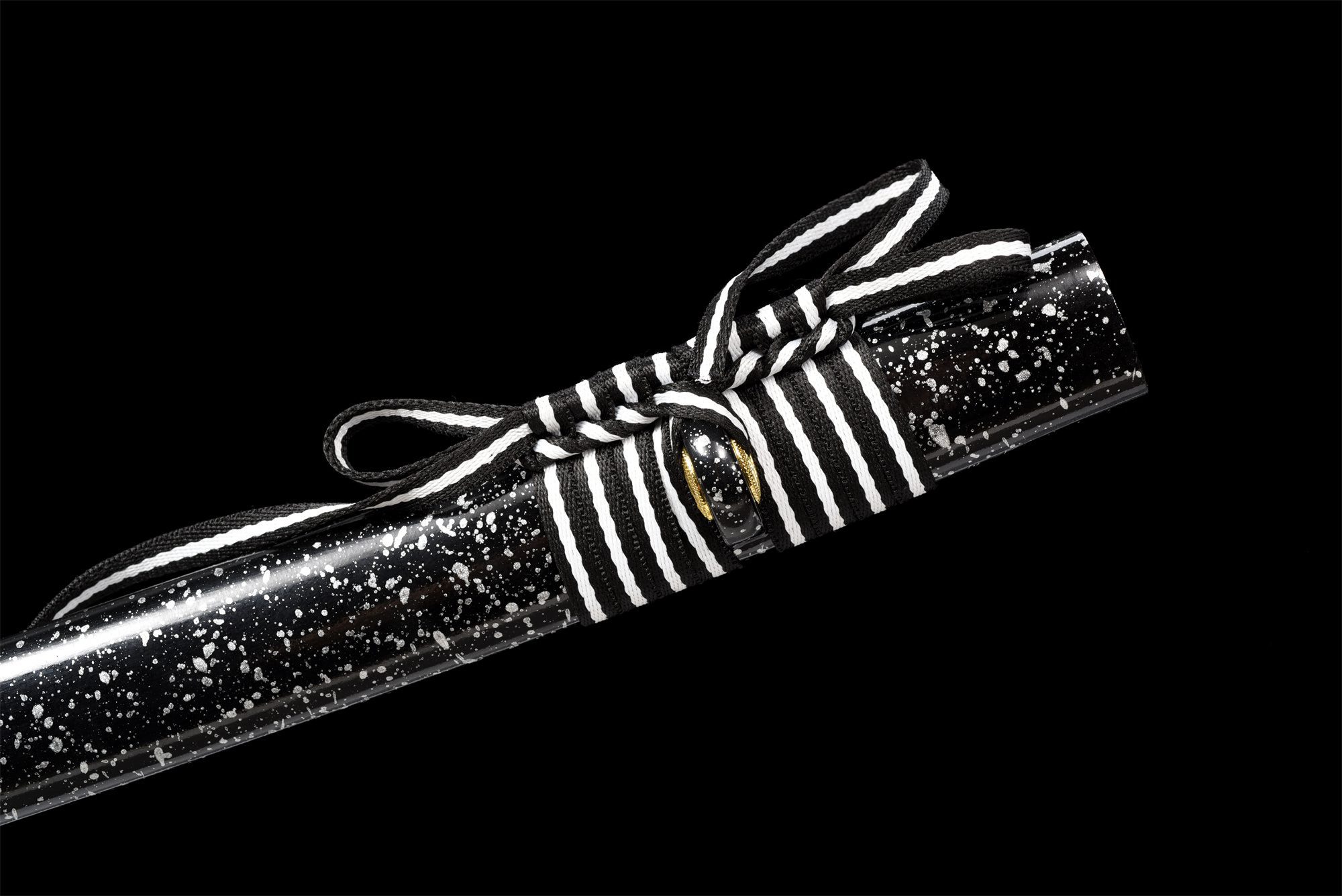 - Schede (Saya 鞘): Zwart gelakt hout met zilveren waterdruppels.