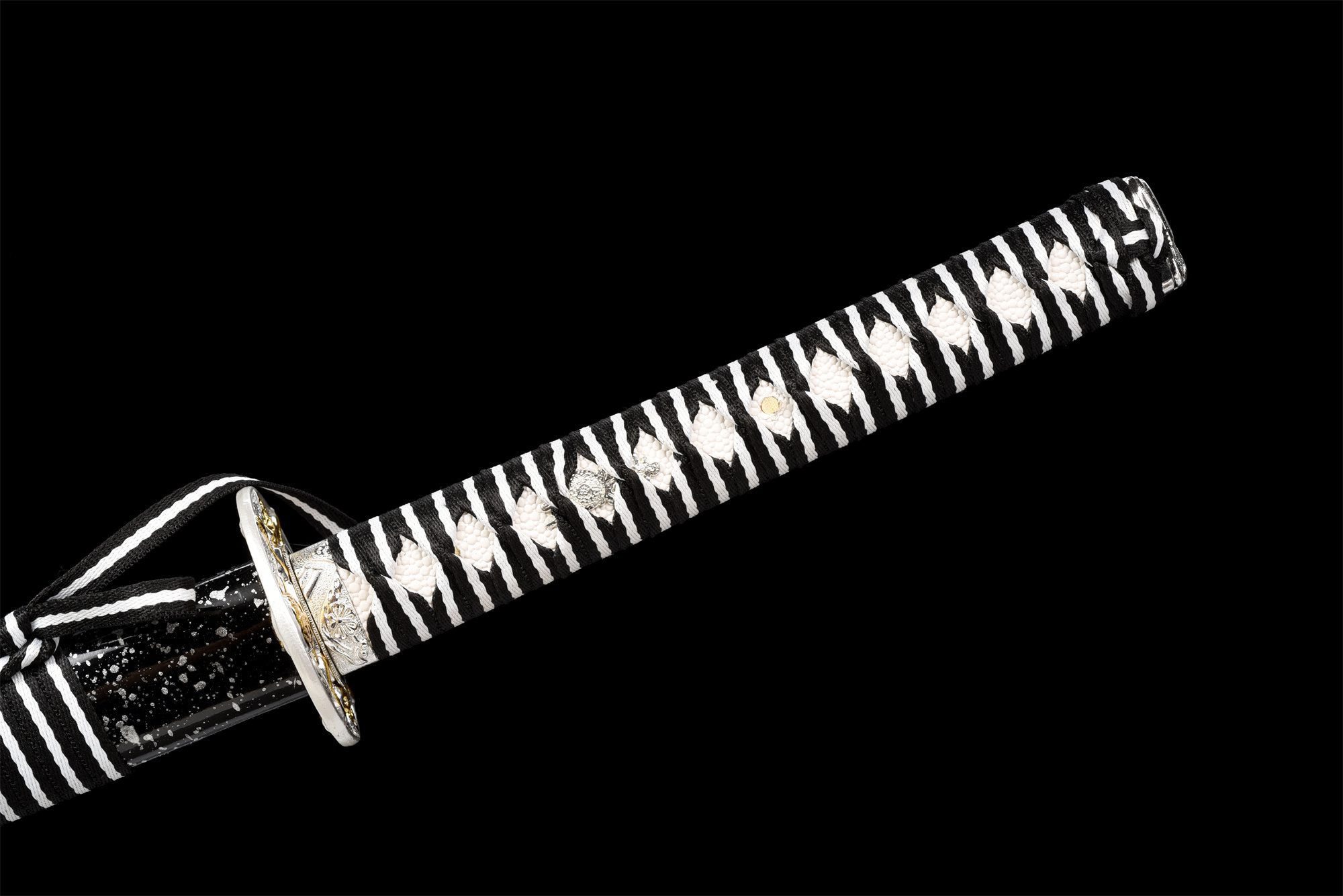 - Tsuka-ITO (柄糸): Zwart en wit gevlochten boven het handvat in een ruitpatroon.