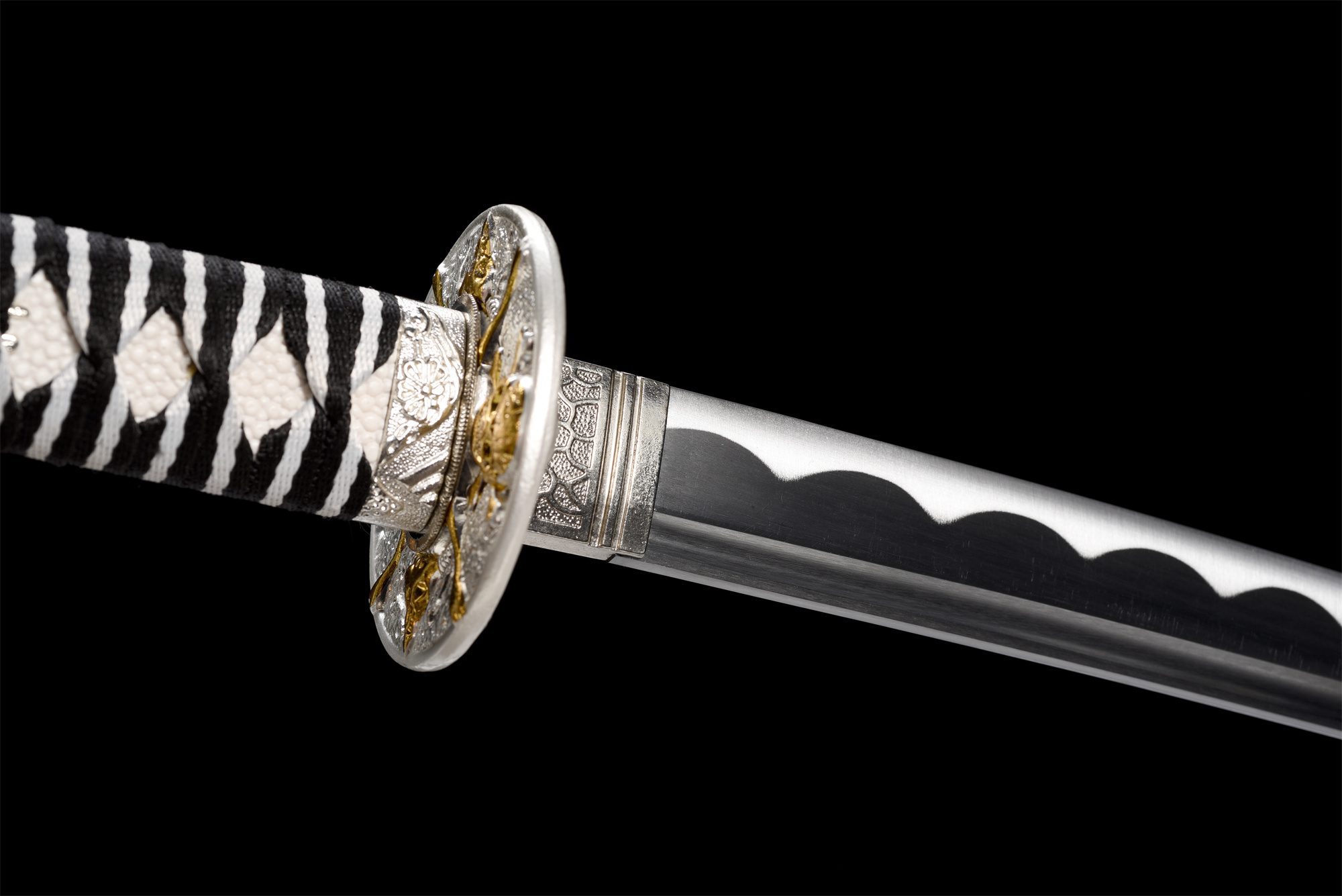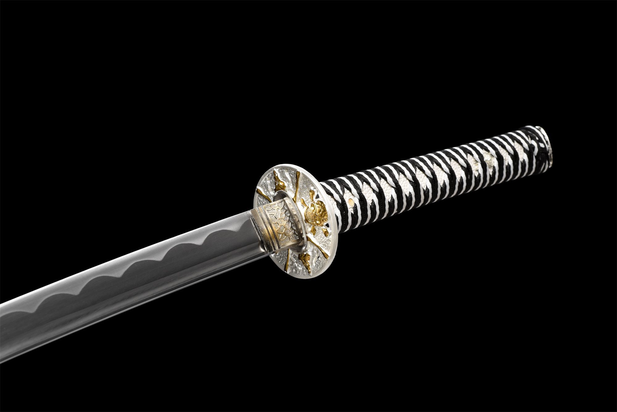 Het 1060 stalen lemmet heeft een diepzwarte afwerking die doet denken aan maanloze nachten waarop piraten de zeeën bevoeren, terwijl de echte notare hamon, verkregen door differentiële harding, zilverachtige golven langs de snede creëert. De bo-hi holt het lemmet uit om het totale gewicht te verlichten en produceert een karakteristiek fluitend geluid wanneer het wordt bewogen. De afgeronde zilveren tsuba is versierd met gouden schedels, een iconisch symbool van piraterij, omlijst door zilveren fuchi en kashira met verfijnde bloemmotieven. Het handvat combineert traditioneel wit imitatie-roggenleer met zwart-witte tsuka-ito-vlechtwerk met ruitpatroon, wat een opvallend contrast creëert dat wordt versterkt door zilveren menuki. De zwartgelakte houten schede is versierd met zilveren waterdruppels die doen denken aan zeespray, aangevuld met een zwart-witte sageo.