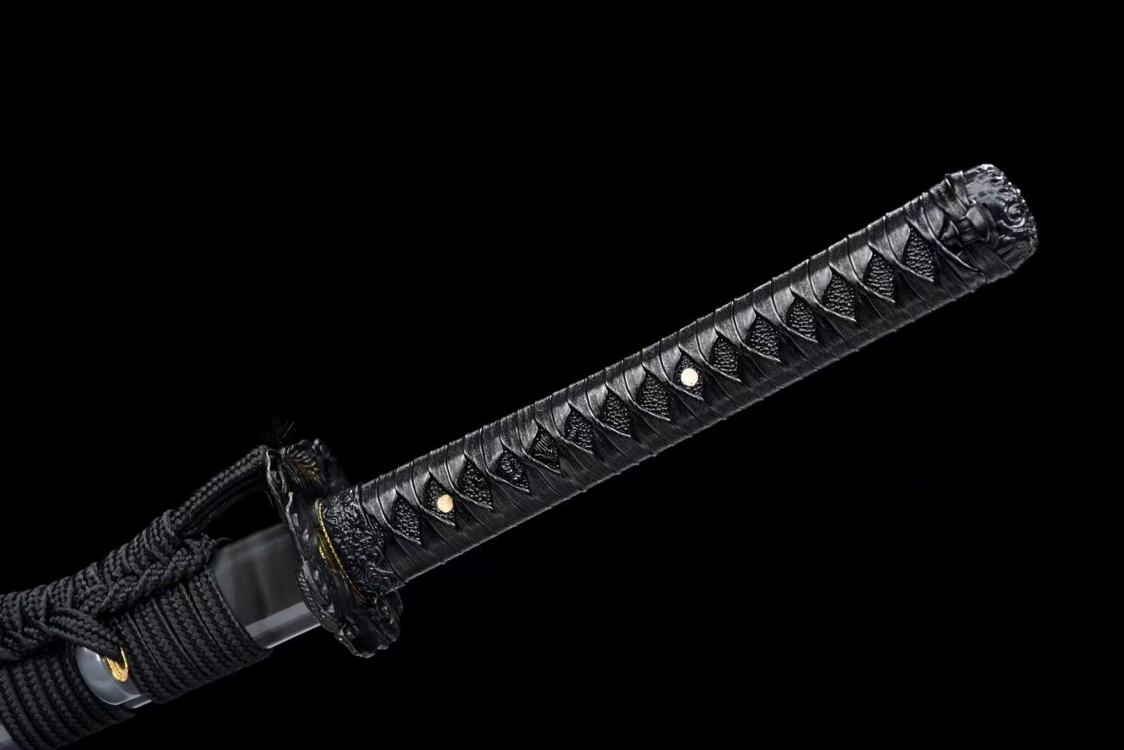 - Bescherming (Tsuba 鍔): zwarte legeringring met een gouden draak rondom de bescherming.