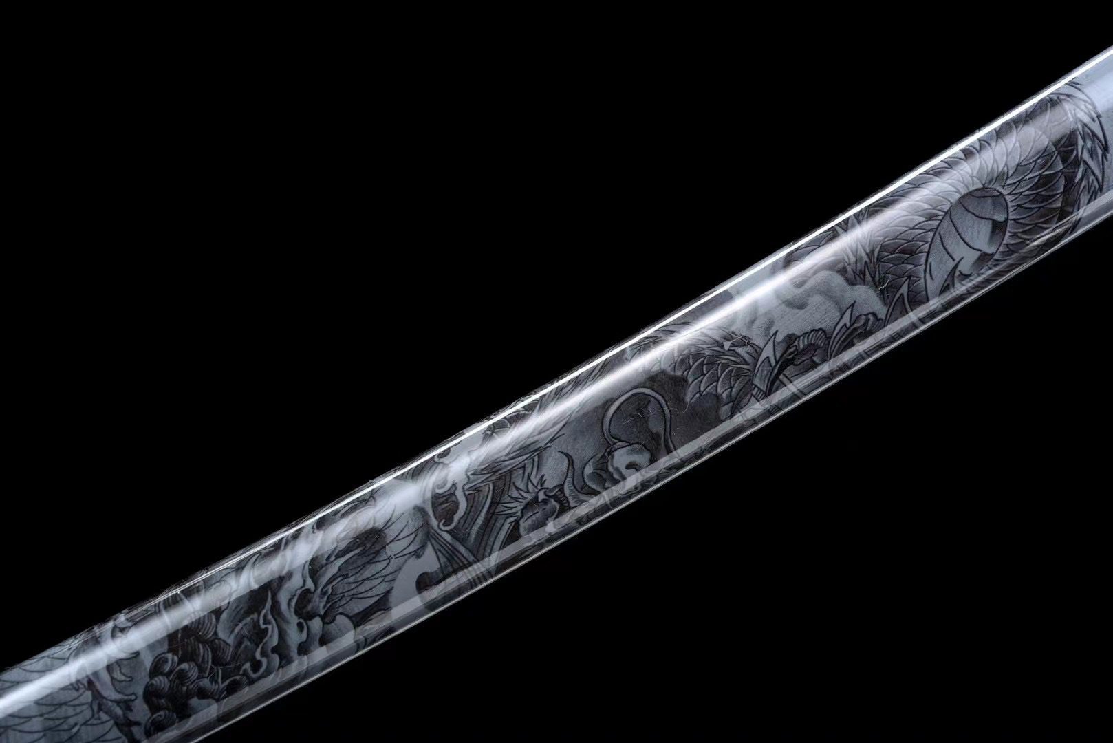 - Schede (Saya 鞘): grijs en zwart gelakte houten schede met drakenfresco.