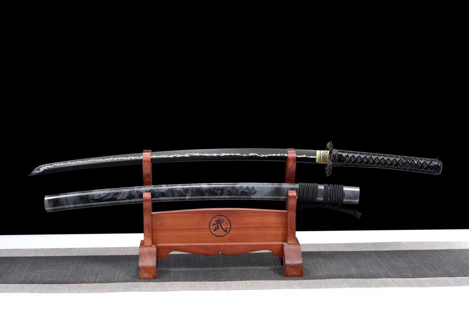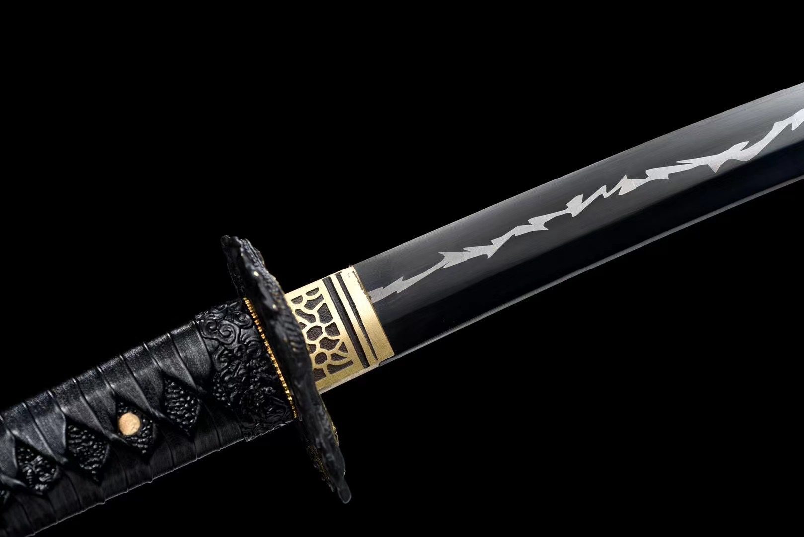 Het zwarte T10-stalen lemmet heeft een donkere afwerking die doet denken aan onweerswolken die de bliksem voorafgaan. Deze diepe tint contrasteert prachtig met de gouden messing habaki versierd met zwarte patronen, wat een opvallend visueel effect creëert. De ronde zwarte legering tsuba is voorzien van een fijn gesneden gouden draak die zich rond de beschermkap kronkelt en goddelijke bescherming symboliseert. Het handvat combineert op harmonieuze wijze zwarte roggenhuid (samegawa) en hout, terwijl de zwarte tsuka-ito een ruitvormige vlecht vormt die zorgt voor een stevige en elegante grip. De menuki stellen zwarte draken voor die discreet in het geheel opgaan, en de gebeeldhouwde fuchi-kashira van zwarte legering maken deze verfijnde esthetiek compleet. De grijs en zwart gelakte houten schede is voorzien van een drakenfresco dat de saya tot een waar kunstwerk maakt, terwijl de zwarte sageo de finishing touch geeft aan deze monochrome compositie, verrijkt met goud.