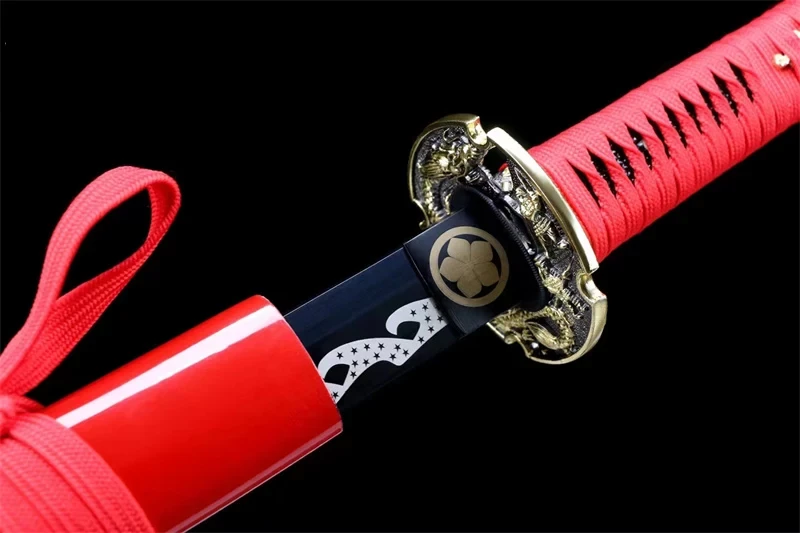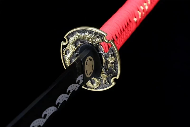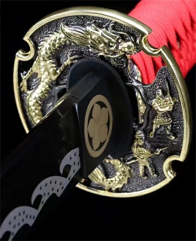 Rode Draak Katana Zwaard, met een gouden draak die zich om de pareerstang kronkelt en een draak die over de schede loopt. Op de habaki is een gouden bloem in een cirkel te zien, terwijl het middernachtblauwe lemmet een witte hamon heeft in de vorm van golven met kleine sterren. De rode katoenen Tsuka Ito bedekt een Pu Black Samegawa-handvat met een vergulde draakvormige menuki. De sageo is ook rood.