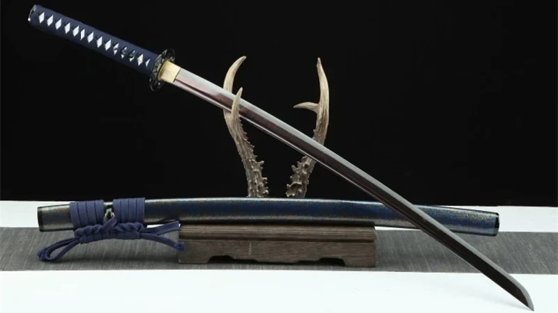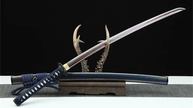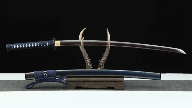 Het Ruri- of Lapis Lazuli-katana-zwaard heeft een Damascus-stalen lemmet in fascinerende blauwe en rode tinten. De holle, klavertjeviervormige beschermkap geeft het zwaard een unieke, elegante uitstraling en biedt tegelijkertijd een uitstekende grip. Het handvat, bedekt met imitatie wit roggenleer, is omwikkeld met blauw diamantvlechtwerk, wat zowel comfort als esthetische aantrekkingskracht biedt. De menuki, versierd met zwarte drakenmotieven, geven dit katana een mystieke dimensie, terwijl de zwarte Fuchi en Kashira, gegraveerd met delicate bloemen, dit meesterwerk perfect afmaken. Ten slotte wordt de Ruri bewaard in een korrelige blauwgelakte houten schede, die aan de taille wordt vastgemaakt met een dikke blauwe Sageo, een extra verwijzing naar de kleuren van deze blauwe steen die symbool staat voor intelligentie.