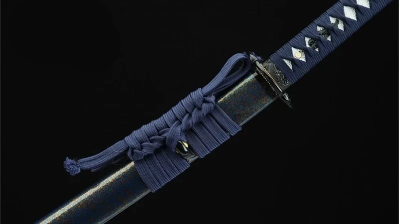 - Tsuka-ITO (柄糸): blauw, gevlochten in een ruitpatroon boven het handvat.