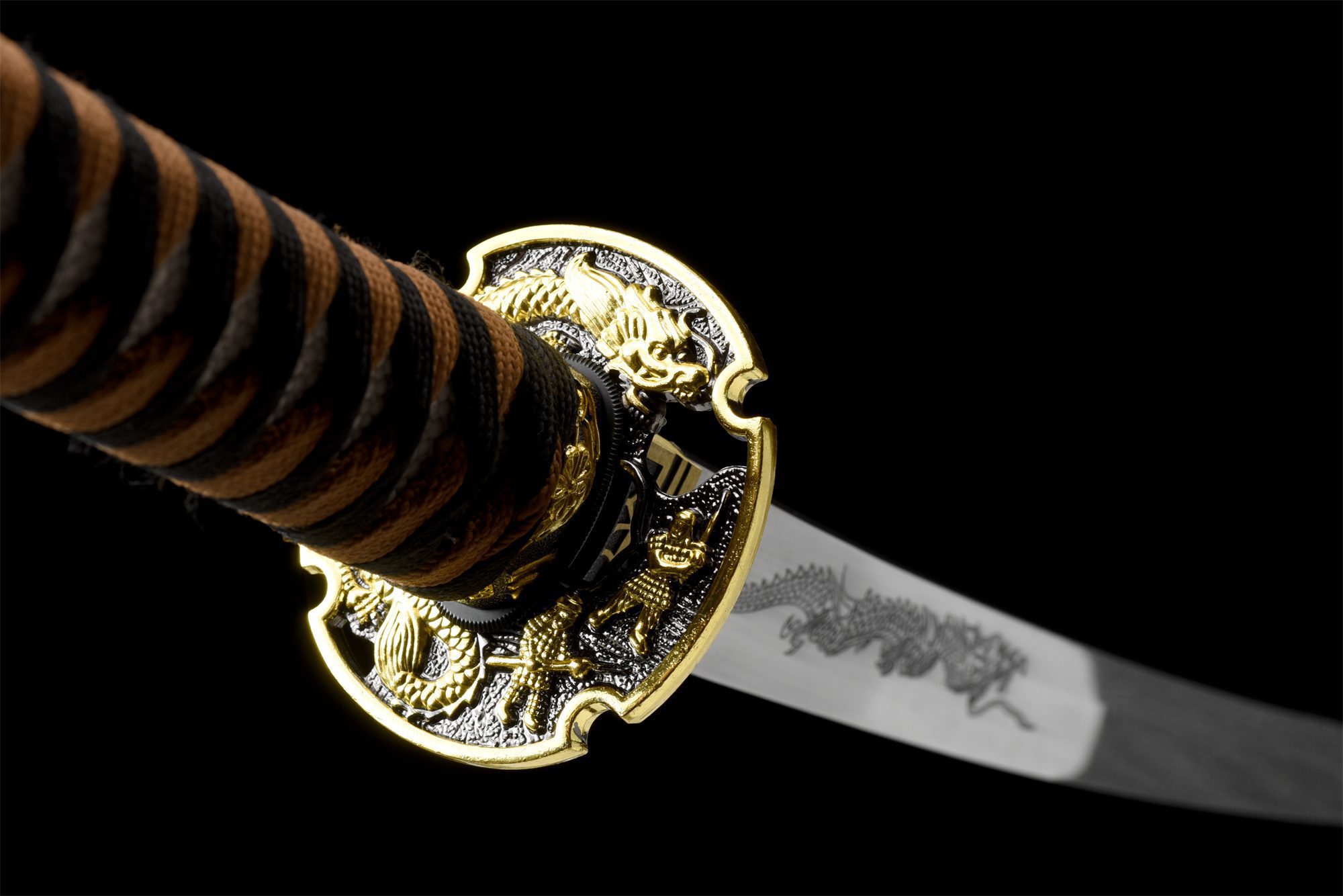 Het mangaanstalen lemmet is voorzien van een gegraveerde draak die zich elegant over het oppervlak slingert en het uitzonderlijke vakmanschap van onze ambachtslieden laat zien. De afgeronde pareerstang tsuba, vervaardigd uit een vergulde en zwarte legering, is voorzien van een fijn gebeitelde draak die de pareerstang omcirkelt, waardoor een harmonieuze overgang naar het lemmet ontstaat. Het handvat (tsuka) combineert traditioneel imitatie wit roggenleer met edelhout, terwijl het bruine en zwarte vlechtwerk (tsuka-ito) ruitpatronen vormt die zorgen voor een veilige en esthetische grip. De gouden menuki maken het geheel verfijnd af. De zwartgelakte houten schede (saya) is voorzien van een gouden draak die aansluit bij het graveren op het lemmet, waardoor de algehele esthetiek van dit uitzonderlijke stuk wordt verenigd.