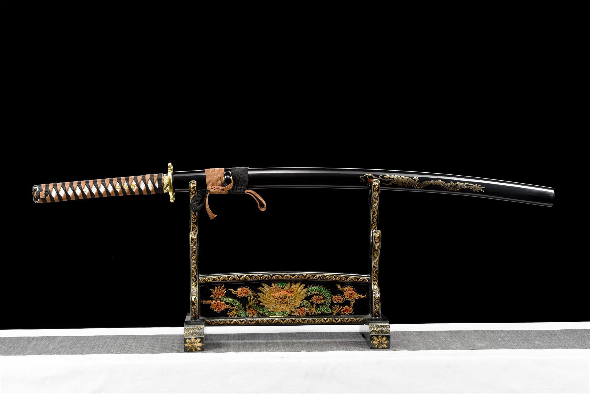 - Schede (Saya 鞘): Zwart gelakte houten schede met gouden draak.
