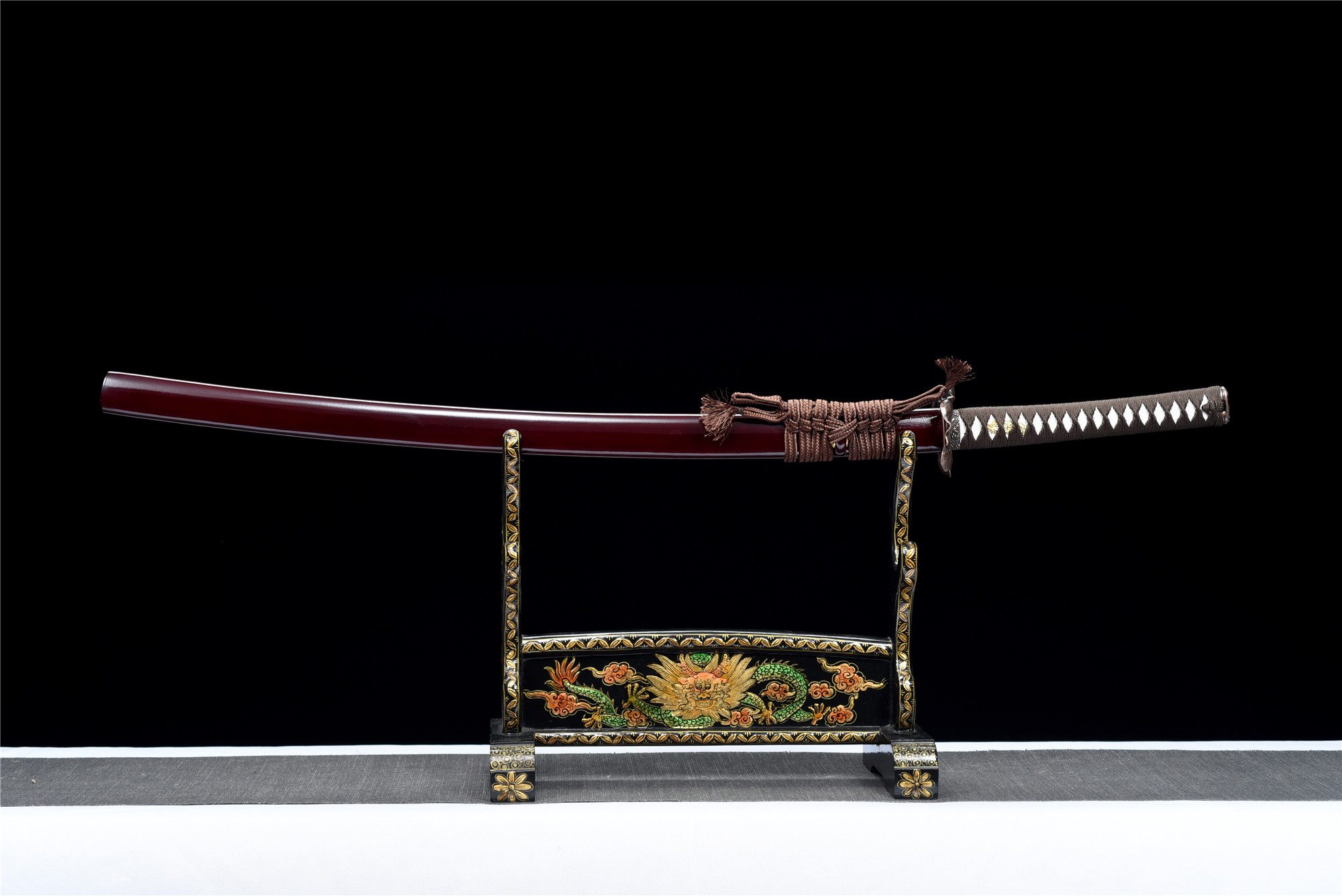 Het mangaanstalen lemmet onthult een authentieke hamon, het resultaat van traditionele differentiële harding die subtiele golven langs de snede creëert. De bronzen tsuba is voorzien van een bladmotief in reliëf dat harmonieus aansluit bij de bloemversieringen op de fuchi en kashira, waardoor een verfijnde decoratieve consistentie ontstaat. Het handvat combineert de textuur van witte imitatie roggenhuid met bruine diamantvormige vlechtwerk, terwijl de gouden menuki een vleugje ingetogen elegantie toevoegen. De roodgelakte schede contrasteert prachtig met de bruine sageo, waardoor een evenwichtig kleurenschema ontstaat.