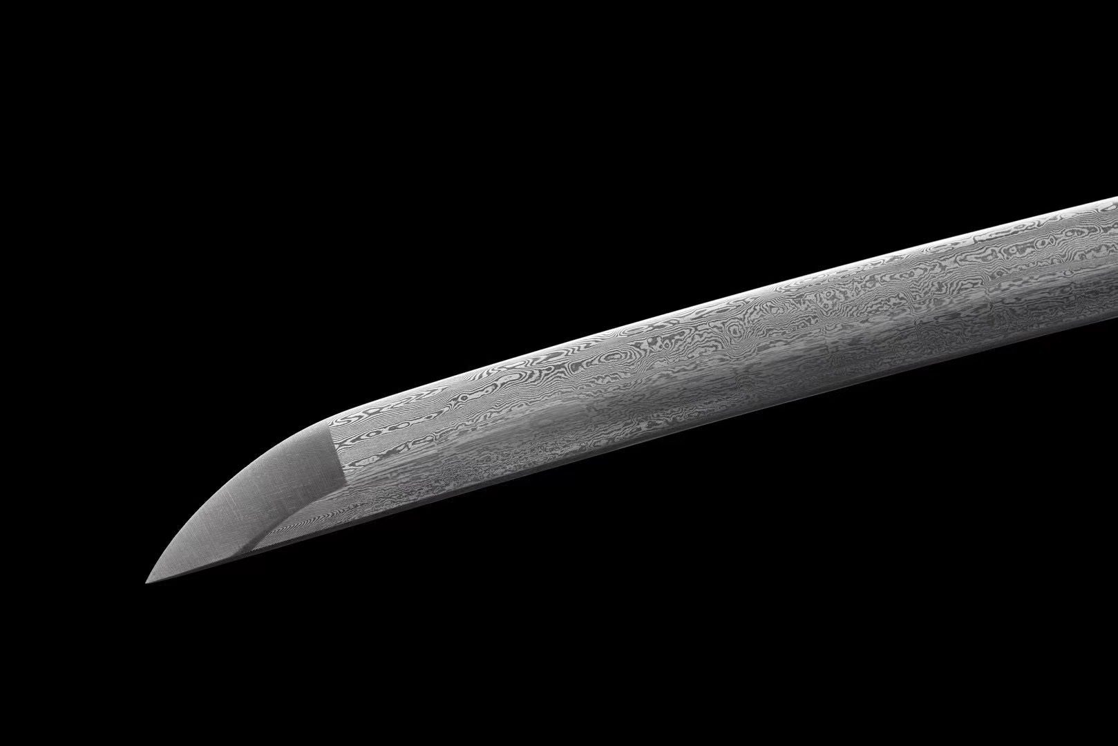 Het Damascus-stalen lemmet vertoont de karakteristieke golfpatronen van dit uitzonderlijke metaal, waardoor subtiele reflecties over het gepolijste oppervlak dansen. Deze oude smeedtechniek geeft het lemmet een unieke schoonheid en zorgt tegelijkertijd voor zijn sterkte. De ronde zwarte legering tsuba valt op door zijn artistieke afbeelding van een samoeraikop, een constante herinnering aan het krijgerserfgoed van dit wapen. Het handvat (tsuka) combineert op harmonieuze wijze traditionele witte roggenhuid (samegawa) met zwart vlechtwerk (tsuka-ito) in een ruitpatroon, wat zorgt voor een stevige en elegante grip. De menuki stellen zwarte draken voor, symbolen van kracht en bescherming in de Japanse cultuur. De zwart gestreepte schede (saya) onthult blauwe en gouden reflecties die het licht vangen, waardoor een opvallend contrast ontstaat met de zwarte uiteinden van de kojiri en koiguchi. De zwarte sageo maakt dit geheel op sobere wijze compleet.