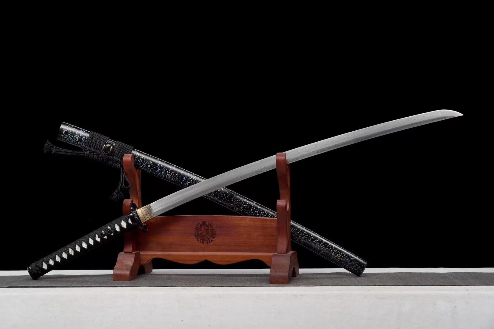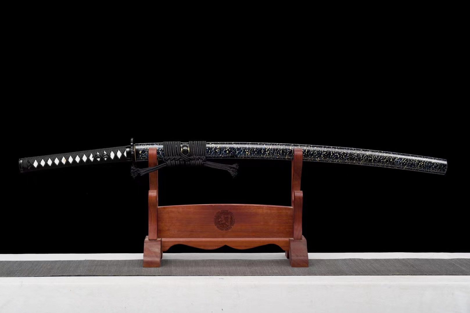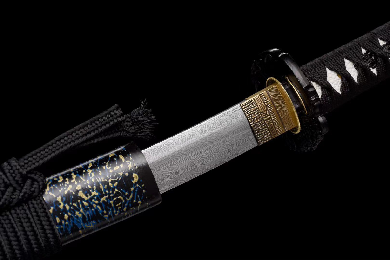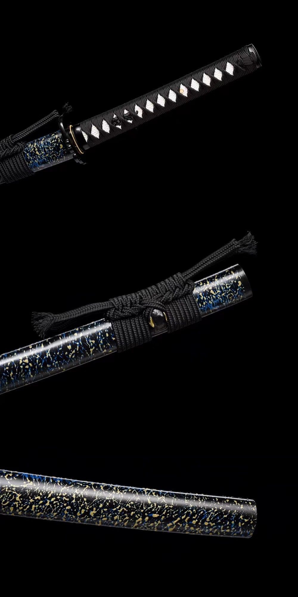 - Schede (Saya 鞘): gemaakt van zwart gelakt hout met blauwe en gouden accenten, zwarte uiteinden (Kojiri en Koiguchi).