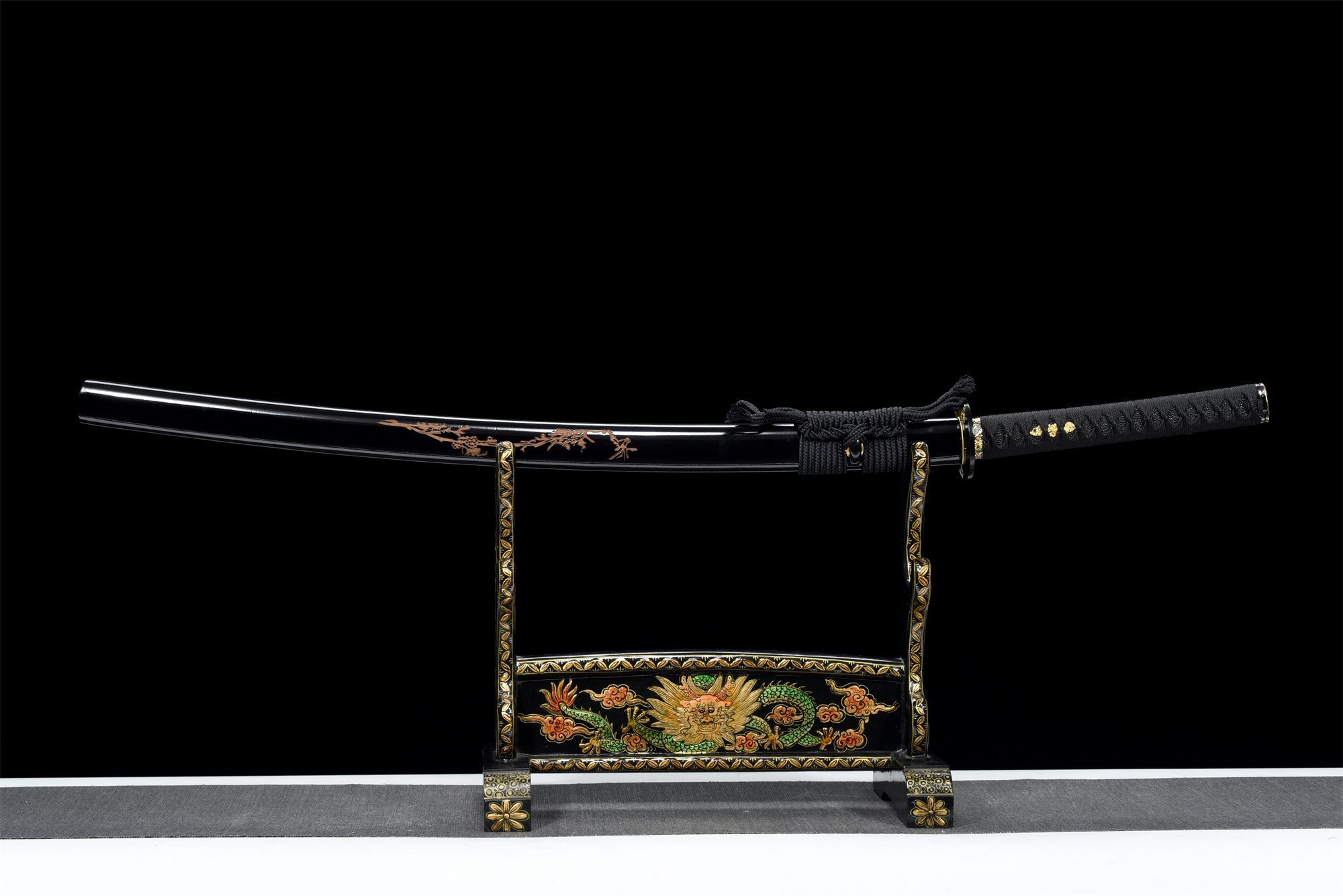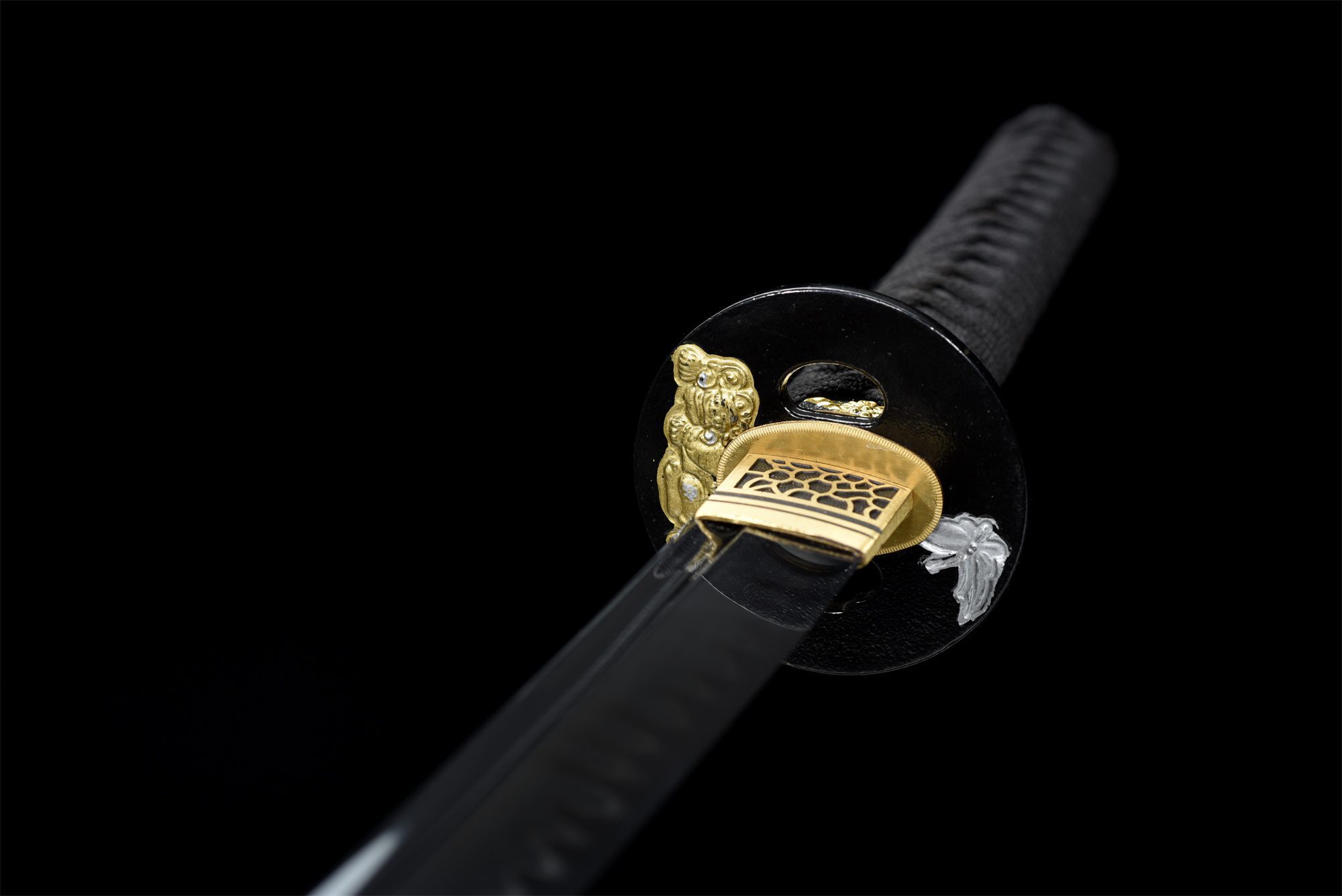 - Bescherming (Tsuba 鍔): Afgeronde zwarte legering met een gouden bloemversiering en een kozuka-hitsu.