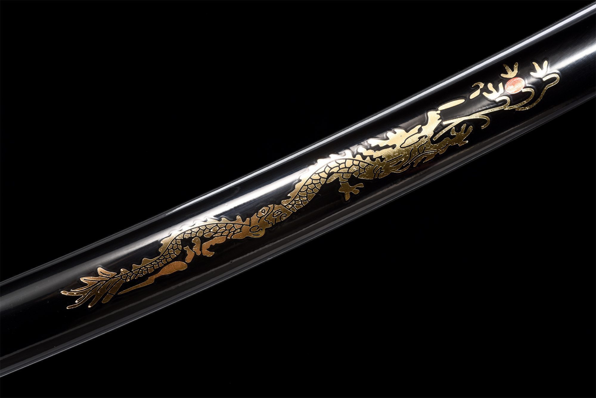 - Schede (Saya 鞘): Zwart gelakt hout versierd met een gouden draak.