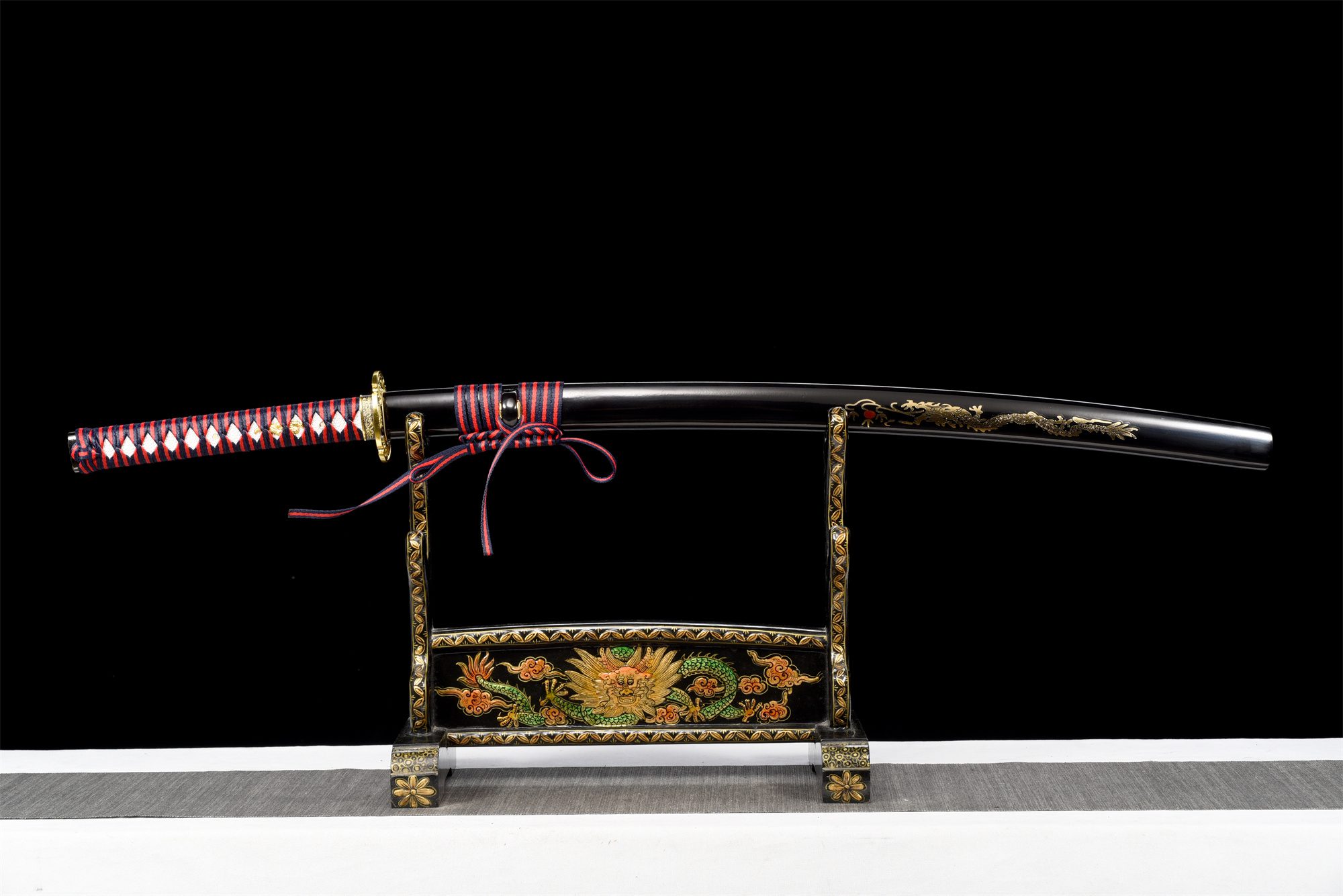 Het 1060 stalen lemmet heeft een diepzwarte afwerking die prachtig contrasteert met de authentieke notare hamon, gecreëerd met behulp van traditionele differentiële harding. De bo-hi holt het lemmet subtiel uit, waardoor de structuur lichter wordt en het karakteristieke fluitende geluid tijdens beweging wordt geproduceerd. De gouden legering tsuba heeft een afgerond kruis versierd met een fijn gegraveerde draak, terwijl de fuchi een nauwkeurig gebeitelde zeeslang onthult. Het handvat combineert een houten basis bedekt met witte imitatie roggenhuid, omwikkeld met blauwe en rode tsuka-ito die een elegant ruitpatroon vormen. De gouden menuki accentueren deze harmonieuze compositie en de zwart-gouden kashira is versierd met delicate bloemmotieven. De zwartgelakte houten schede is voorzien van een gouden draak die over de hele lengte kronkelt, aangevuld met een sageo in blauwe en rode kleuren die bij het handvat passen.