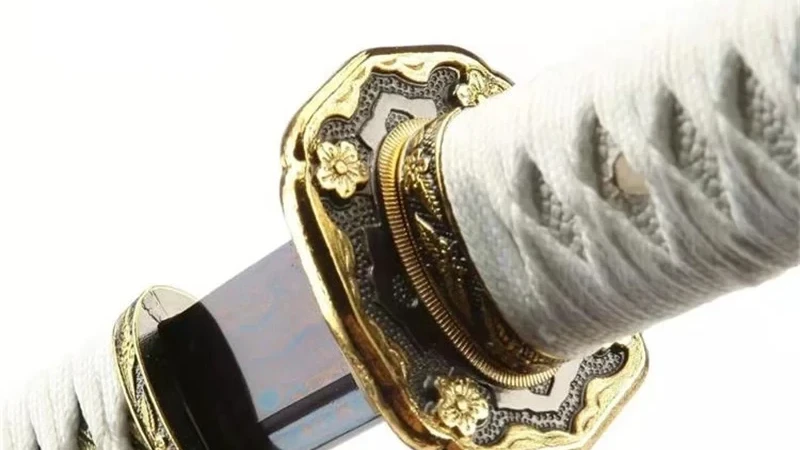 - Menuki (目貫): goudkleurig met 3 open bloemen.