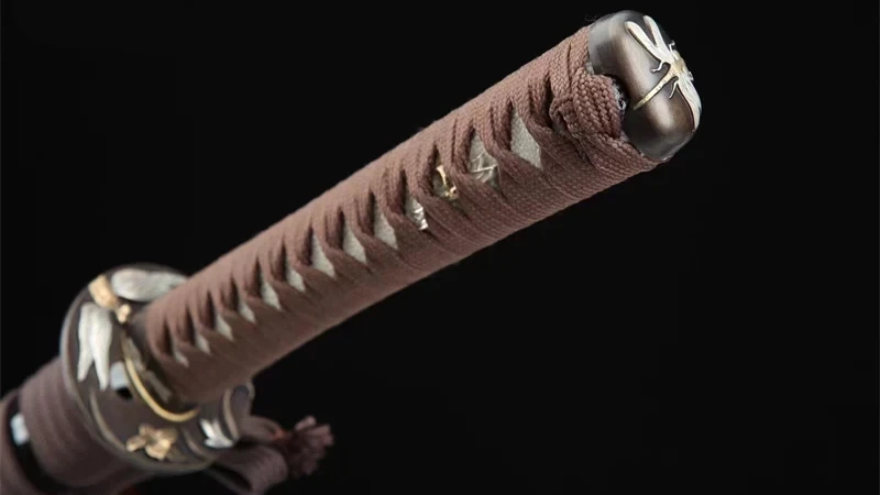 - Kashira (頭): bijpassende fuchi en beschermkap, bruin met vergulde en verzilverde libelle.