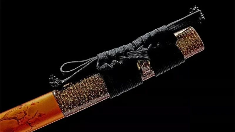 Het Tonbo katana-zwaard (トンボ), ook wel bekend als de Libel, wordt gekenmerkt door zijn T10-stalen lemmet, dat bekend staat om zijn sterkte en schoonheid. De hamon, verkregen door differentiële klei-tempering, heeft een uniek Midare-patroon. De beschilderde houten saya is versierd met rode rozen en herfstachtige oranje bladeren, die de vluchtige schoonheid van de natuur weerspiegelen. Het handvat, omwikkeld met echt wit roggenleer en geweven met zwart ito in een ruitpatroon, biedt een uitzonderlijke grip. De menuki, die zwarte libellen voorstellen, symboliseerden moed en overwinning in de tijd van de samoerai. De rechthoekige messing beschermkap is prachtig gegraveerd met libellen, gecombineerd met een messing Fuchi en Kashira, wat de katana een nobele, verfijnde uitstraling geeft. De gegraveerde messing Habaki met zwarte stippen maakt het geheel af.