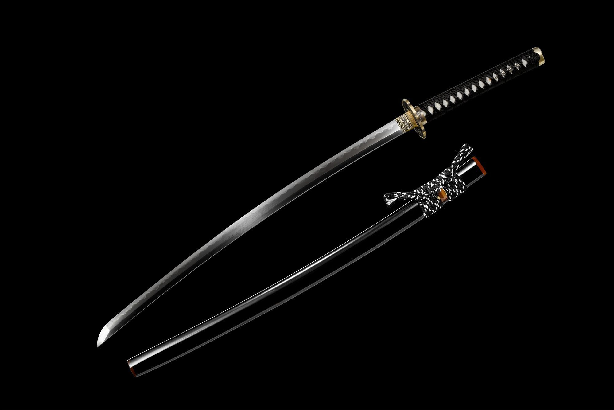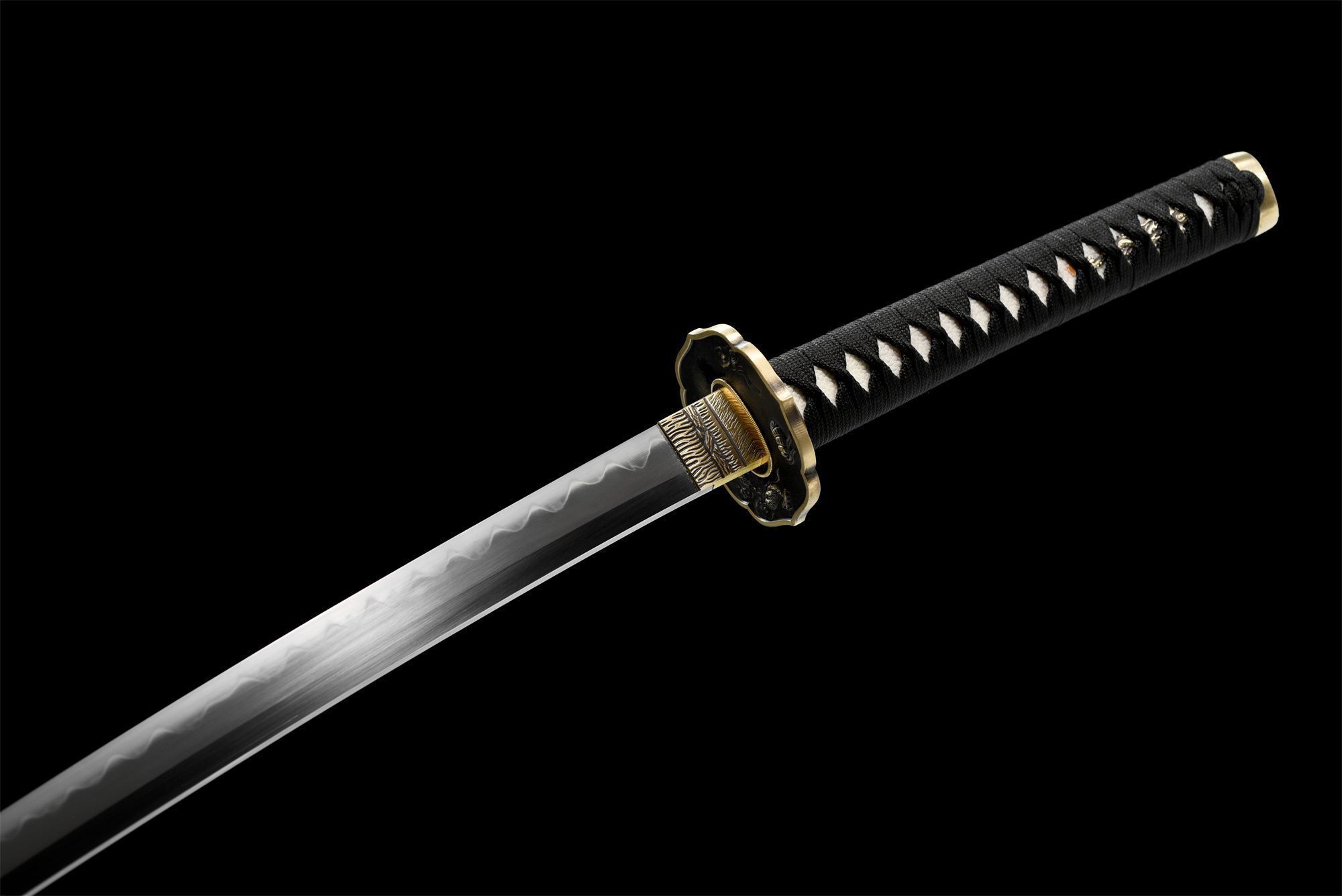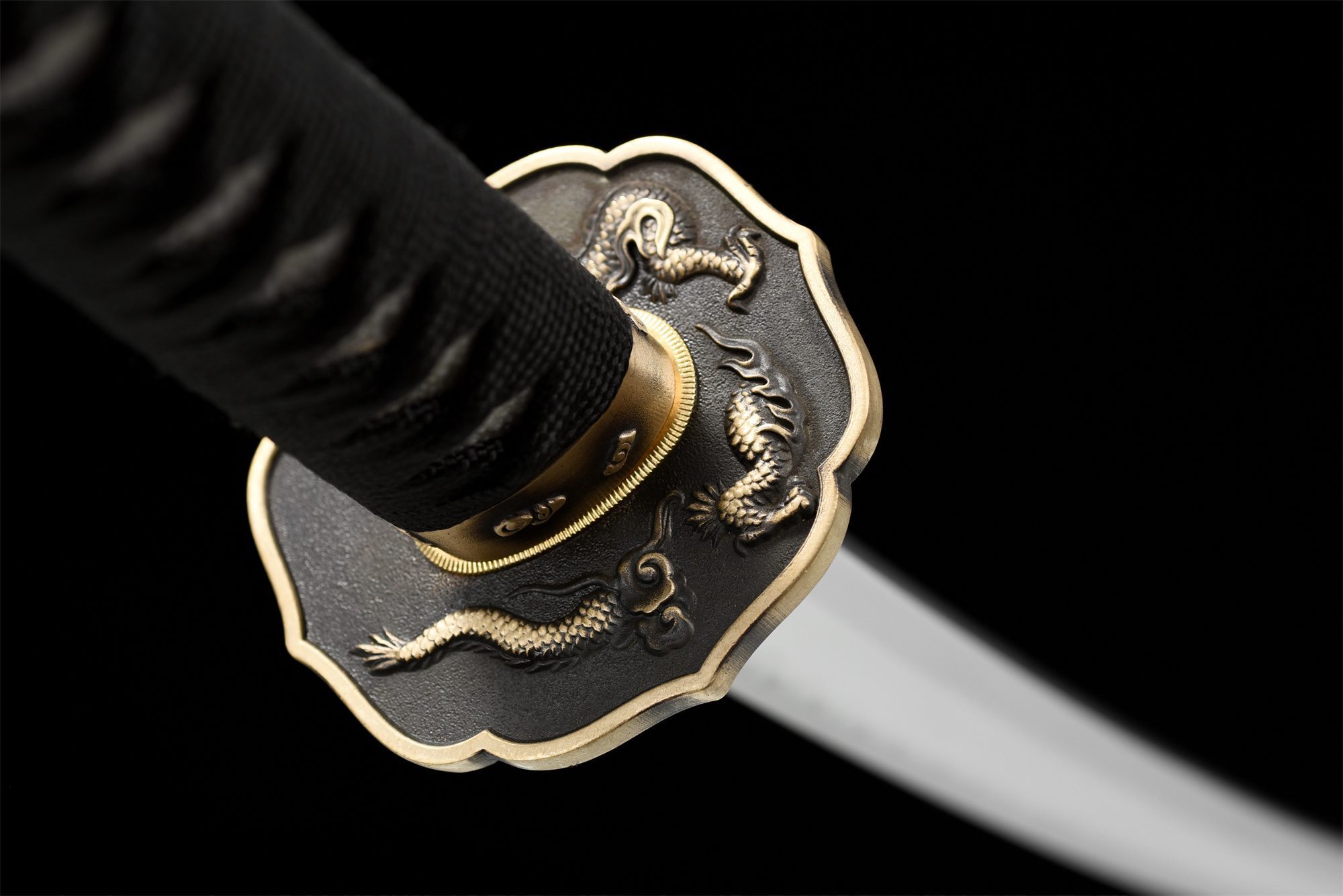 Het T10-stalen lemmet heeft een prachtige Notare hamon, waarvan de golvingen doen denken aan heuvels badend in maanlicht. Deze differentiële harding creëert harmonieuze golven langs de snijkant, wat het technische meesterschap van onze smeden aantoont. De lotusvormige tsuba, gemaakt van goud en zwart koper, is voorzien van een fijn gegraveerde draak die onder water duikt. Het handvat is bekleed met authentieke roggenhuid bedekt met zwart vlechtwerk met ruitpatroon, terwijl de menuki zilveren draken voorstellen die onder de maan lijken te dansen. De fuchi, versierd met een opgerolde draak, en de kashira, gesneden in de vorm van een drakenkop, maken dit drakenmotief compleet. De zwartgelakte houten schede, verfraaid met elementen van echt hoorn bij de koiguchi, roept de diepte van een sterrennacht op.